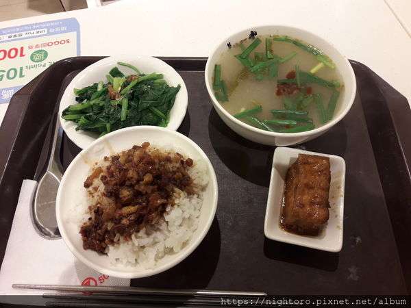 我們點了 2號套餐 有 古早味肉燥飯 赤肉羹 燙青菜 和油豆腐