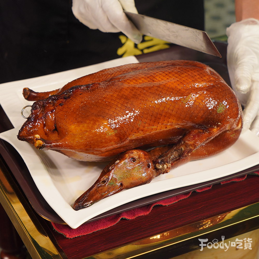 ▼重點來了!「蛤?!Huh Pot」台北忠孝店推出「片皮全鴨三吃」(包廂限定菜色,需提前3天預定),看看這隻烤鴨金奶油亮的外皮,一整個肥美到不行!師傅你切快點,不然我真的想直接整隻拿來啃了!