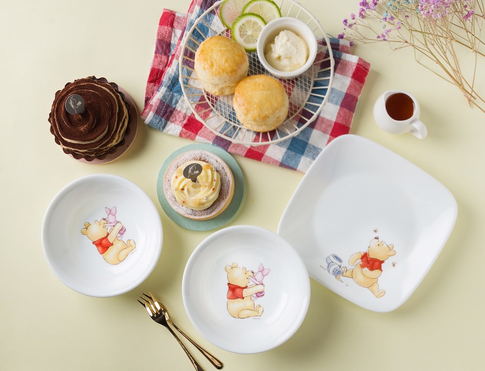▼康寧餐具「小熊維尼系列餐盤」則是把維尼放上餐盤及餐碗花釉圖面,符合微波爐、電鍋等多種家電規格,不論想吃溫熱的蛋糕或烤製香甜餅乾,任何點心甜品都可輕鬆烹製上桌,以不慌不亂手法詮釋萌感十足的午茶派對時光。
