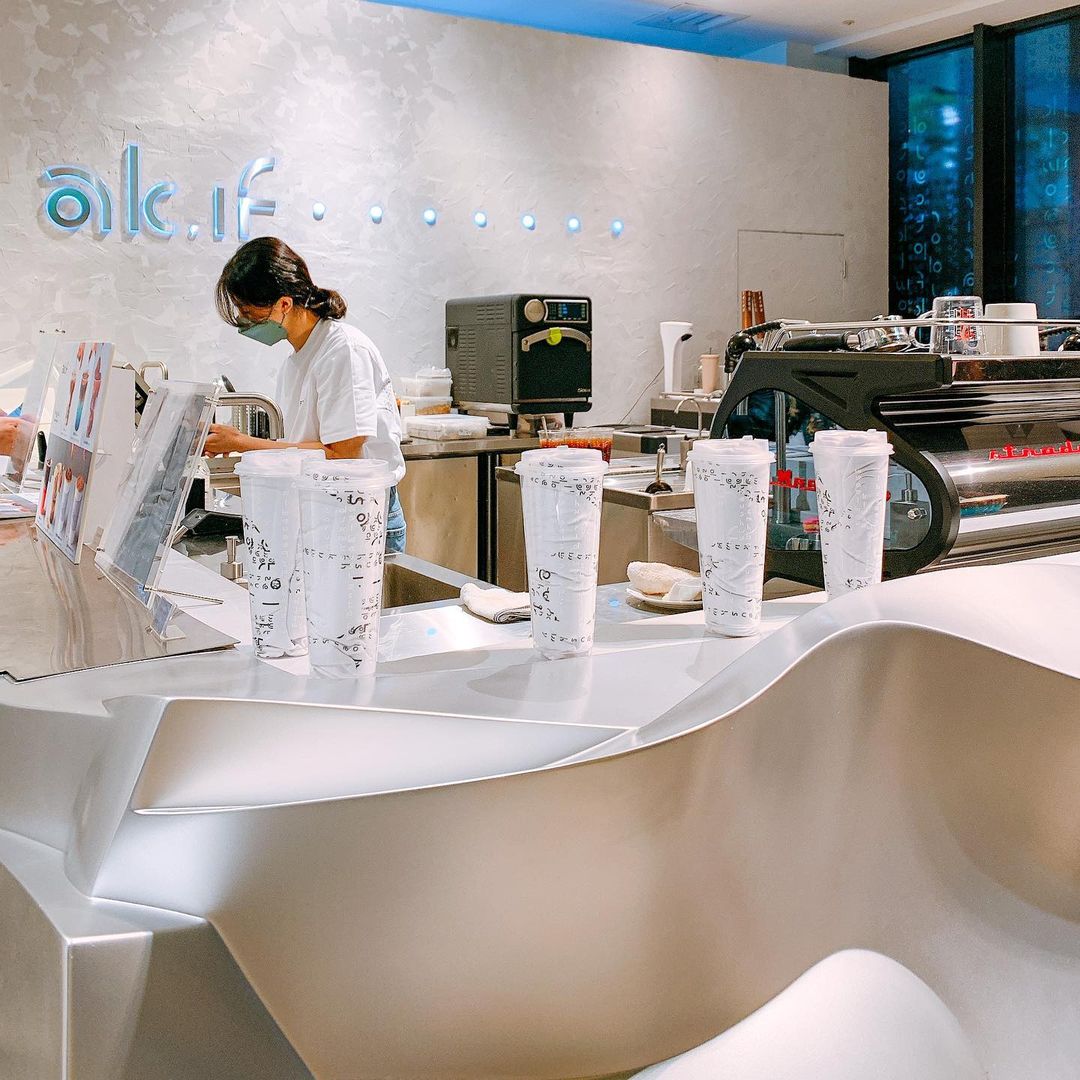 ▼未來咖啡概念店「ak.if」以銀白色為主色調,搭配流線型吧台與牆上佈置等,整體充滿未來感的設計讓人眼睛一亮。不過要說最有未來感的,肯定是超欠喝的「肉桂餅(喝的肉桂捲)」了。