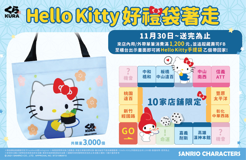 2021年11月10日又吃、又吃藏壽司!繼上次推出一系列可愛「三麗鷗聯名」扭蛋周邊後,藏壽司這次又將於11/30起,於嘉義、彰化、高雄、台北等10間藏壽司店鋪限量滿額送可愛「粉藍色Hello Kitty手提袋」;此外,更推出「甜蝦珍鮭季」超豪華澎湃新品,要幫大家補補冬~
