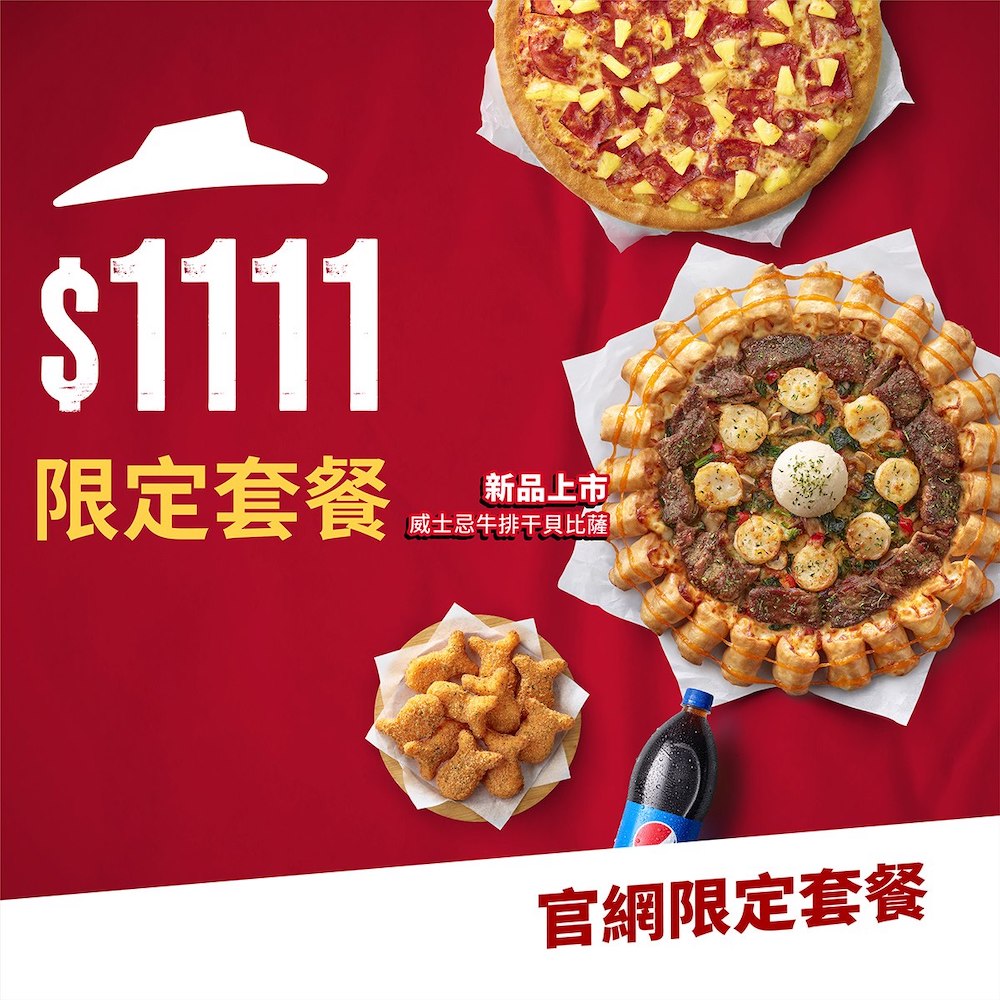▼歡慶雙11,必勝客推出限時優惠套餐,包含豪華升級的新口味也能吃到!「威士忌牛排干貝比薩」搭配「松露起司龍捲風餅皮」,再加上外帶大比薩/外送小比薩、黃金和風鱈魚塊及飲料,限時優惠價只要1111元!超狂優惠只到11/11止,千萬別錯過!