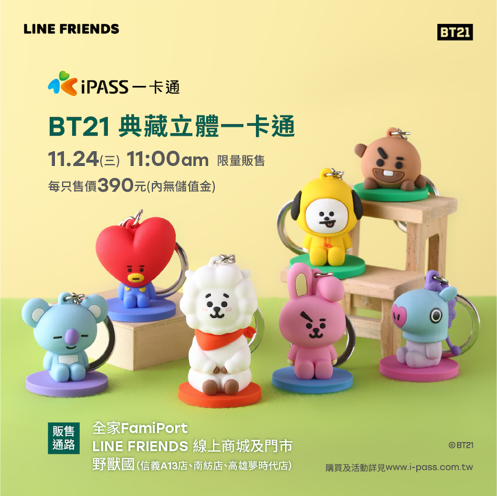 ▼「BT21公仔立體一卡通」共有KOYA、RJ、SHOOKY、MANG、CHIMMY、TATA、COOKY等7個角色,每個售價390元,2021年11月24日上午11點起至11月28日於全家便利商店FamiPort開放預購;另野獸國門市(信義A13店、南紡店、高雄夢時代店)、LINE FRIENDS 線上商城及門市也會同步開賣,各款數量有限售完為止,全套蒐集療癒感滿載,鐵粉們快收藏起來,別錯過囉!