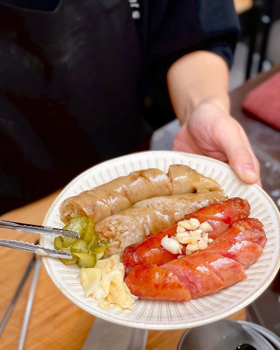 ▼快看看!就連大家平常逛夜市常吃的大腸包小腸,經過簡單擺盤就變得這樣漂漂亮亮,氣質都出來了~泛著光澤的大小腸,糯米腸口感綿密香氣十足,搭配瘦肉比例較多的香腸,口感不油膩又香嫩好吃。