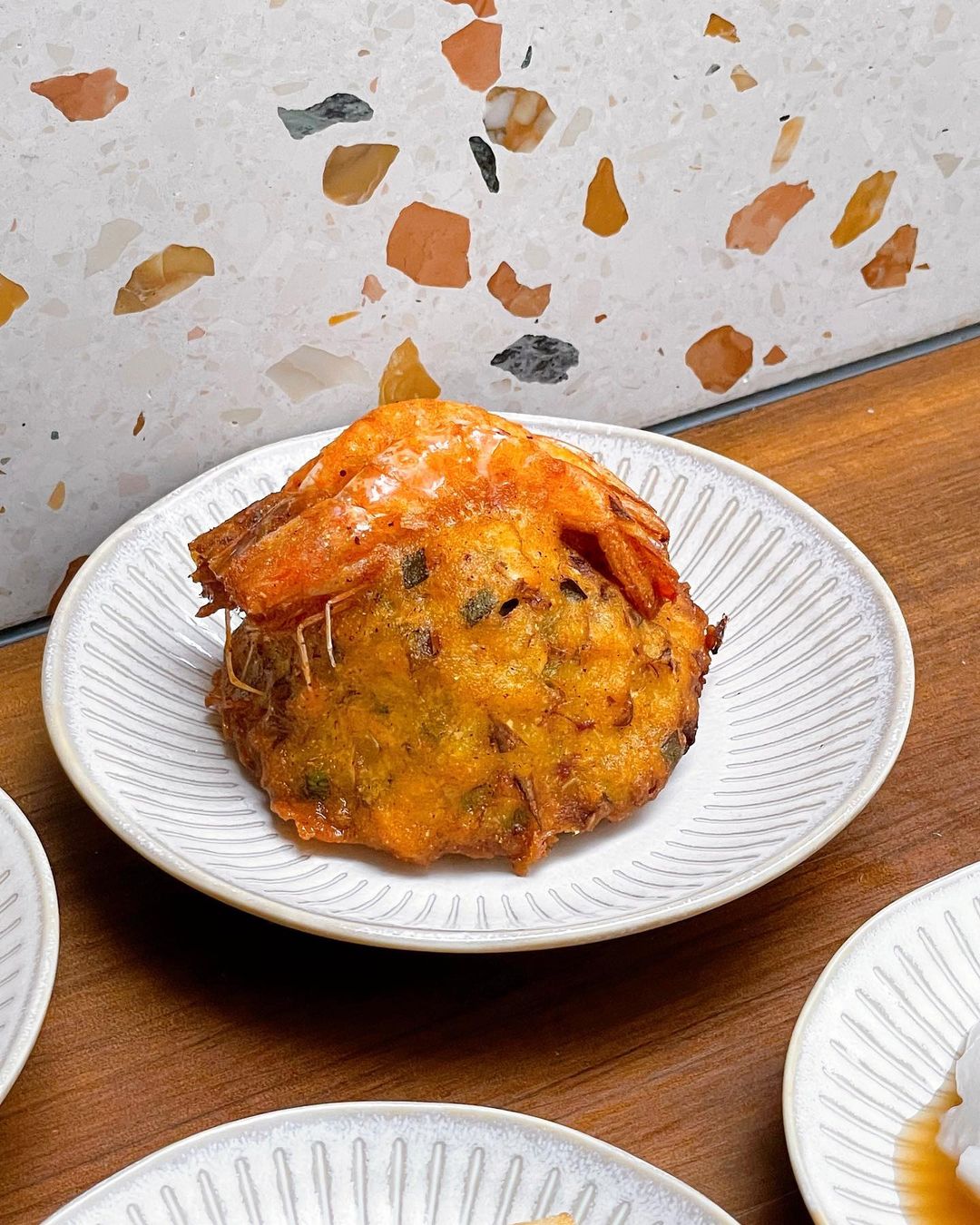 ▼說起台式古早味怎麼可以少了炸粿?「蚵嗲點蝦」(75元)把傳統蚵嗲滿滿鮮嫩豬肉餡+蔬菜尬在一起,酥脆外皮咬下是燙口多汁內餡,上面更過分直接擺上3尾鮮蝦,鹹香美味層次感十足~