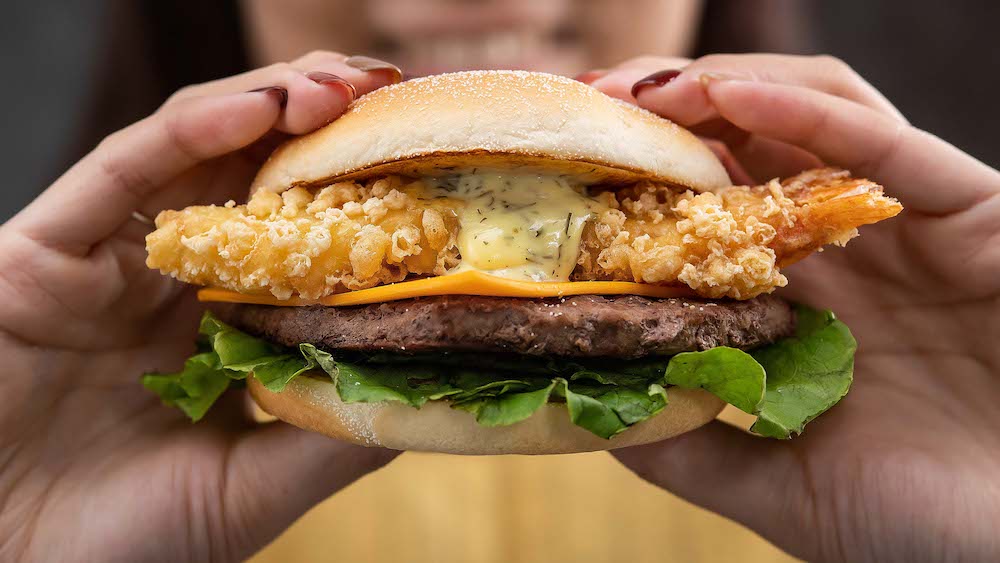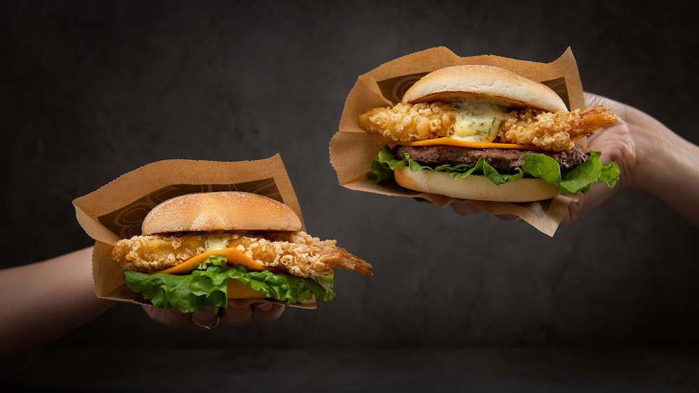 ▼太平洋白蝦裹粉後進入182度高溫油鍋,製作成口感外酥內軟的「天婦羅」入堡,搭配嚴選頂級厚實的四盎司安格斯牛肉,高溫煎製、鎖住濃郁肉汁,佐以濃郁的青檸蒔蘿醬,清新的果香與蒔蘿的獨特風味與天婦羅及牛肉完美交融,搭配整片原葉生菜及切達起司,口感與味蕾都能品嚐到豐富層次,味覺、視覺也能享受豪邁海陸的極致風味!