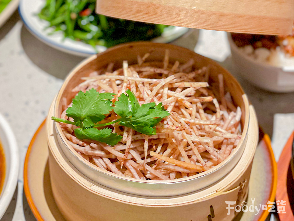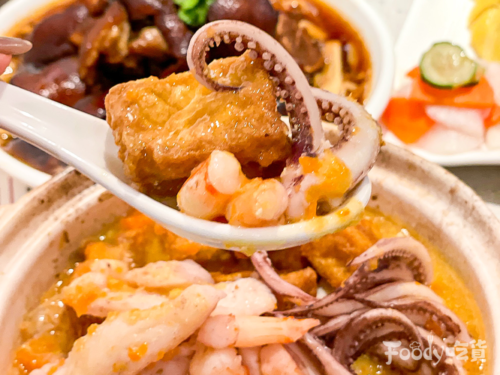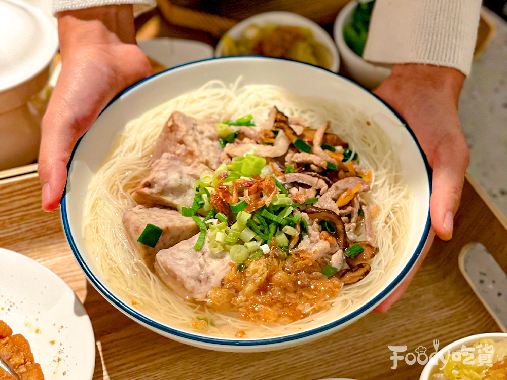 ▼「丰禾台式小館」今年以芋絲米糕和魷魚螺肉蒜參賽,台灣諺語「食米粉芋有好頭路」,芋頭象徵好兆頭,結合辦桌必備的米糕,微微木桶香氣的軟Q米粒,搭配香菇絲、後腿肉絲、蝦米、乾蔥,一口咬下香濃芋香與米香相擁而現;魷魚螺肉蒜聞得到乾魷魚、螺肉、後腿肉片及蒜苗的香,吃得到甘甜與鮮味,「湯頭三味,一滾清二滾鮮三滾甜」,完美呈現60年代道地酒家菜的風味。