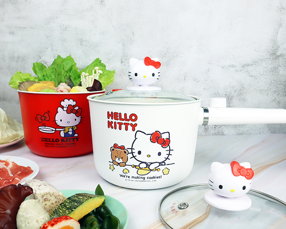 ▼超可愛Kitty設計的Hello Kitty造型保溫杯,紅通通的蘋果色搭配Hello Kitty大頭造型杯蓋帶出門瞬間吸睛+療癒;還有煮湯做菜煮泡麵都必備的電煮鍋,同樣以代表Hello Kitty的經典紅白色系登場,你各位煮夫煮婦還不買起來~?