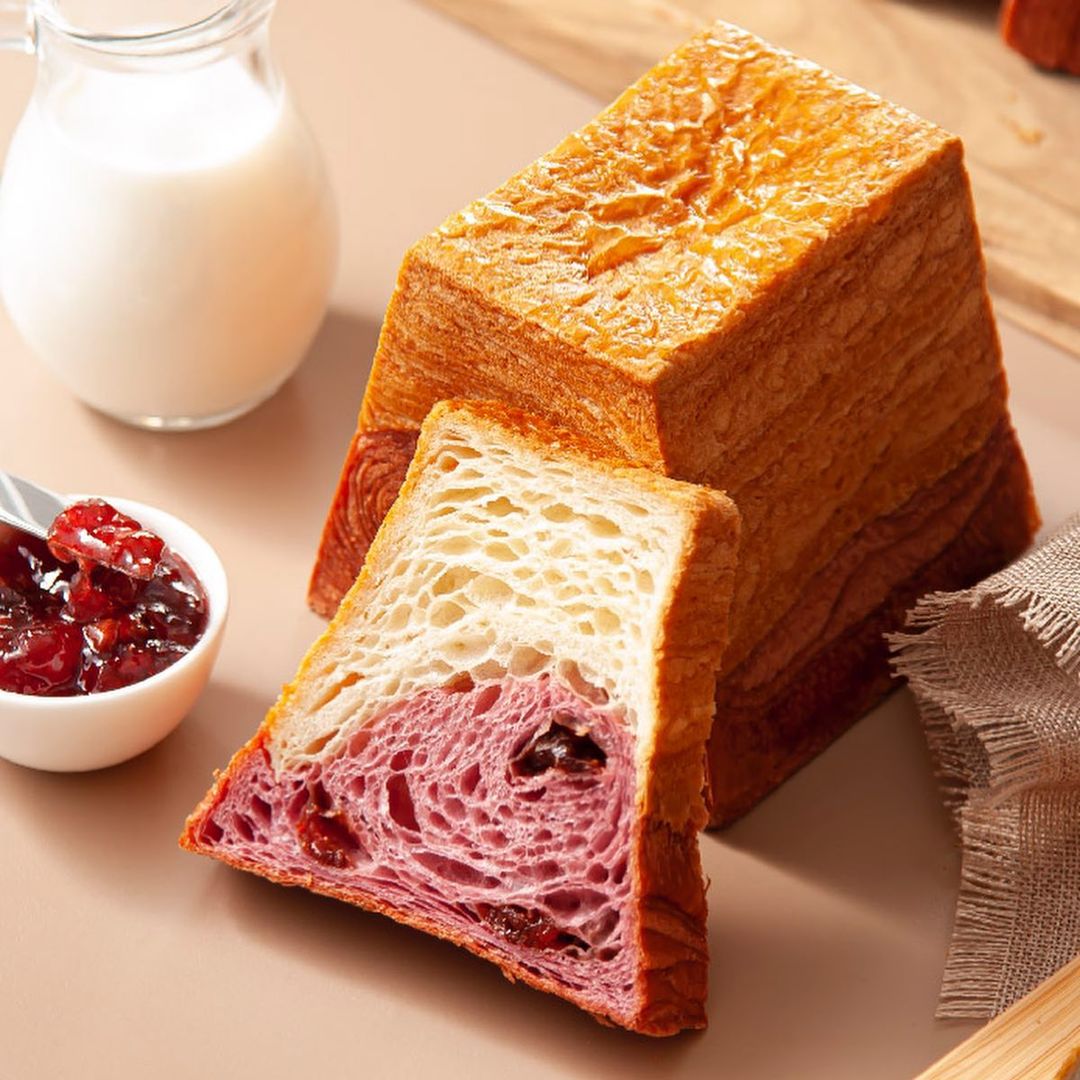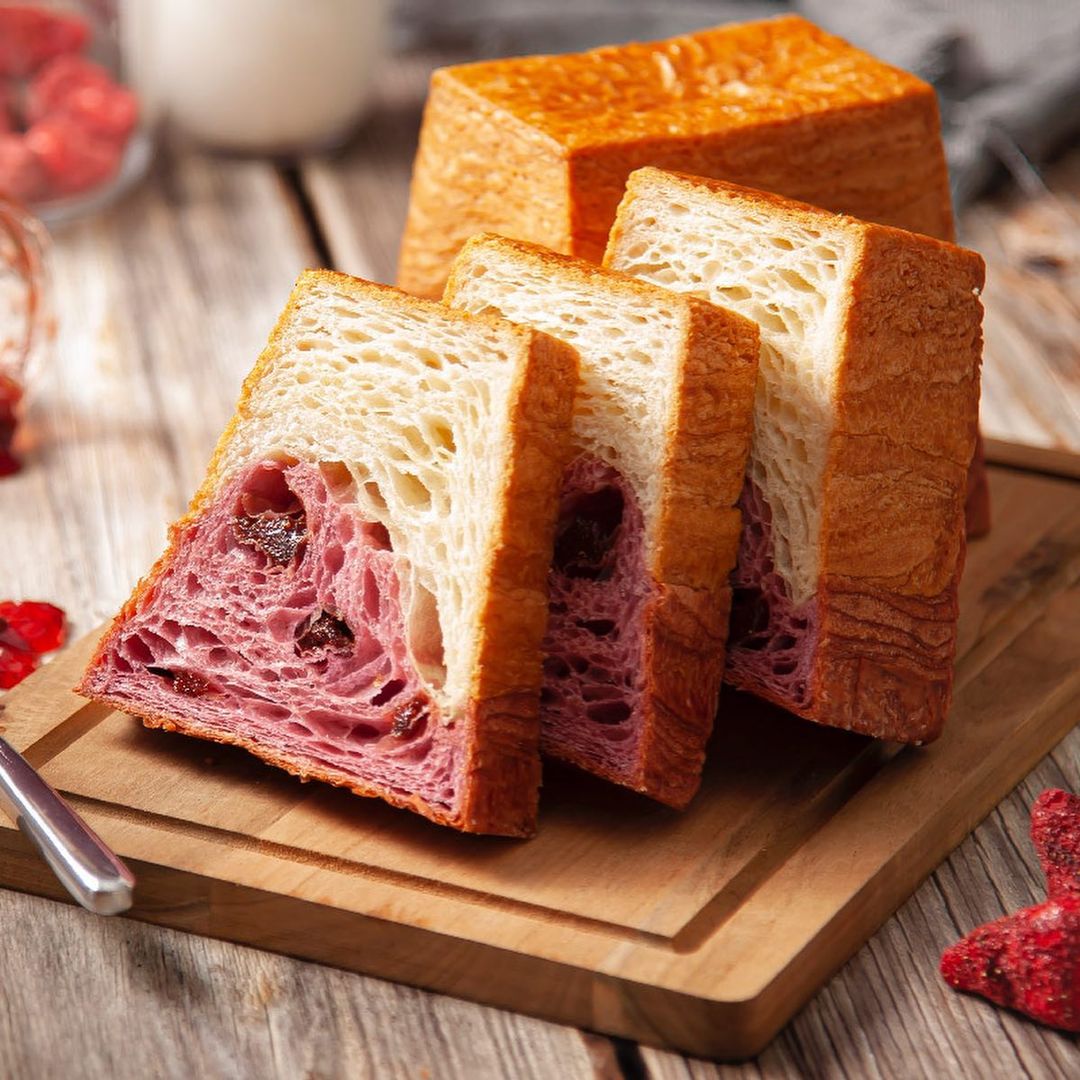 ▼吐司體嚴選日本頂級麵粉混合法國愛樂薇發酵奶油製成,搭配散發淡淡莓果香的蜜漬草莓乾,外皮酥脆口感+鬆軟綿密吐司,不甜膩的滋味讓人一口接一口。