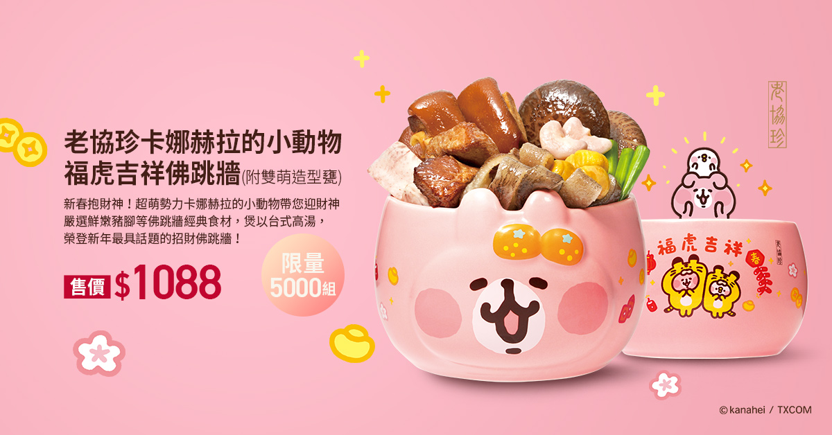 ▼以往於前幾年在飯店團圓的熱潮,這兩年已轉變為居家團圓,安心在家享受圍爐氛圍外~老協珍看準這波商機,再度攜手日本高人氣插畫家卡娜赫拉推出虎年限定「卡娜赫拉的小動物-福虎吉祥佛跳牆」。