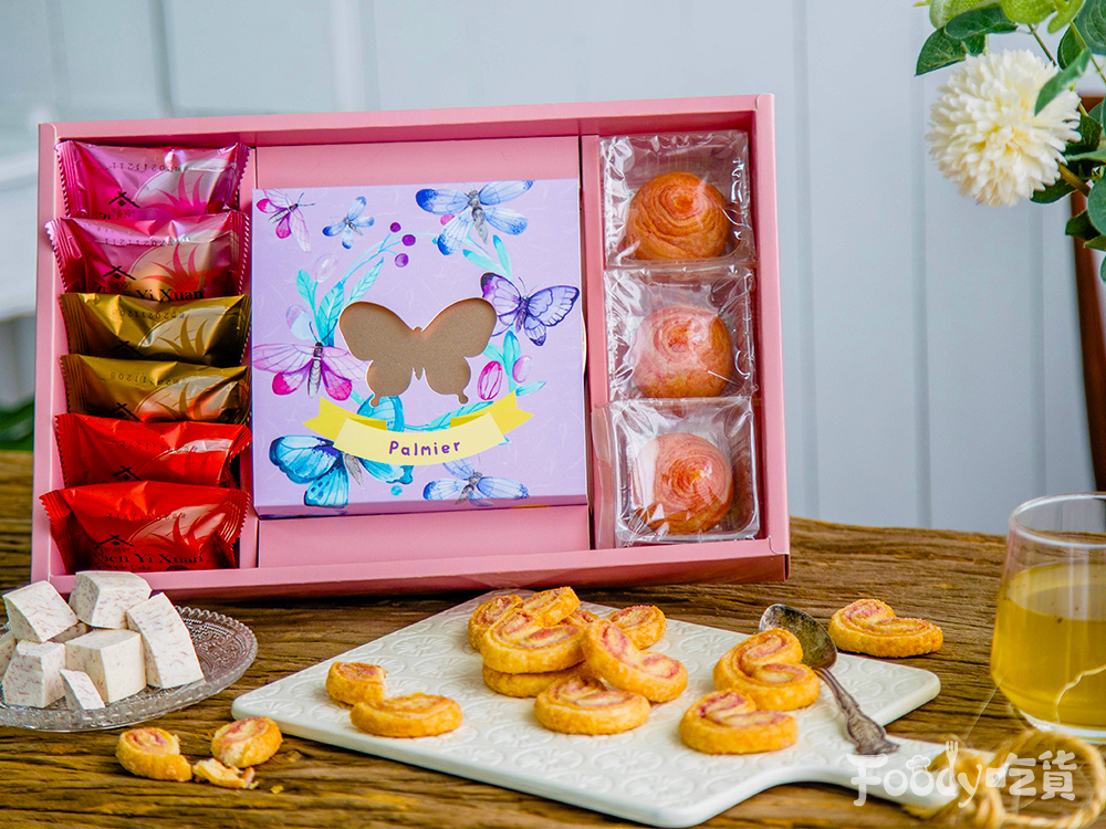 ▼為迎接2022的到來,振頤軒推出多款超人氣禮盒,包裝大器有質感之餘,裡層的糕點口感也是不在話下。「芋蝶迎春禮盒」一盒包含多種糕點,配置豐富大方,不管送誰都非常的合適♡由左到右分別是,左:金鑽鳳梨酥、土鳳梨酥、洛神花酥各兩顆;中:蝴蝶酥 1盒;右:芋泥草莓流心酥3顆。