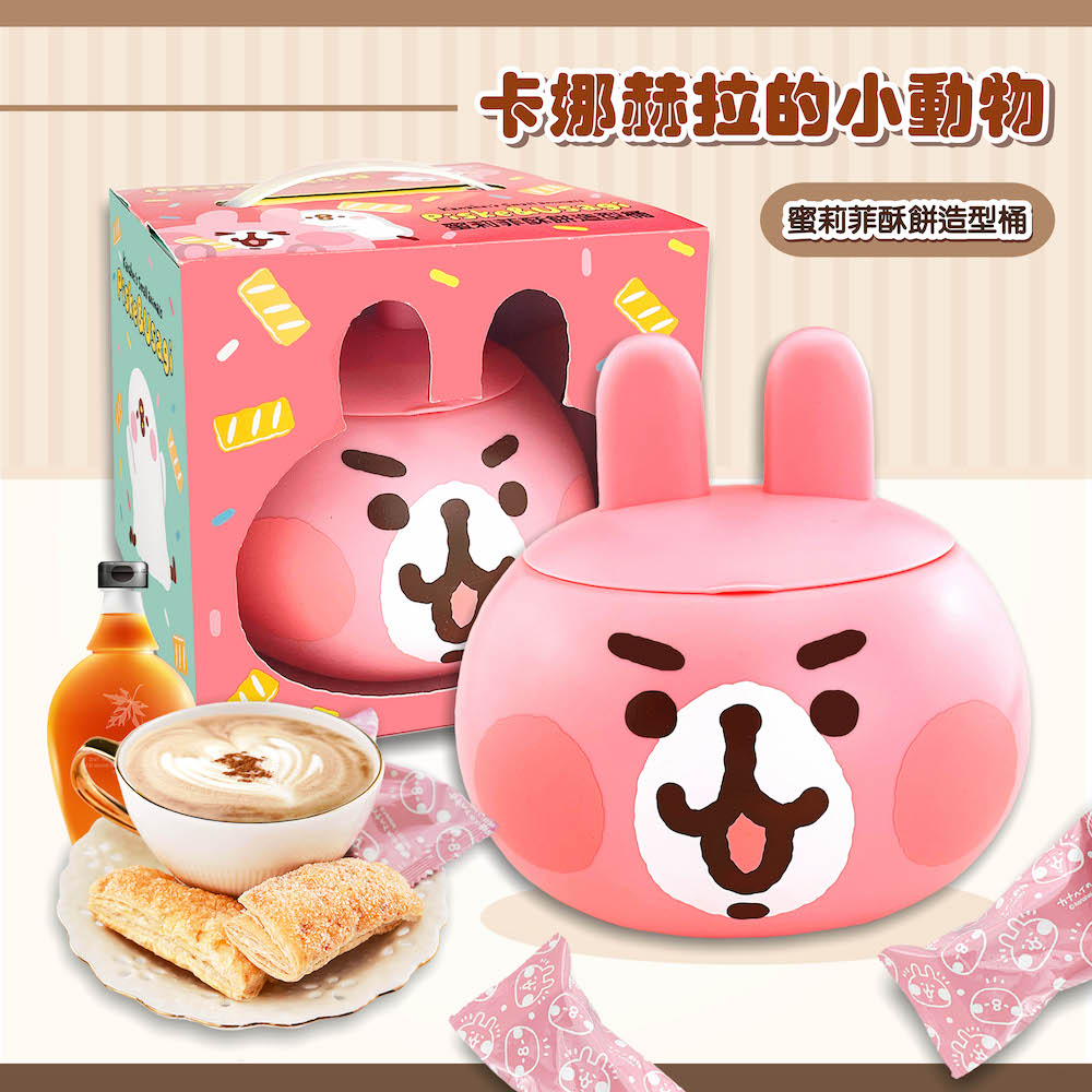▼超可愛粉紅兔兔造型桶第二彈登場!「卡娜赫拉的小動物蜜莉菲酥餅造型桶」(399元/盒,12入),粉紅兔兔生動又傳神的活力表情為你加油!高質感造型桶內有美味的楓糖千層派,外層顆粒砂糖與奶油酥皮雙重香脆口感越嚼越溶入嘴裡~