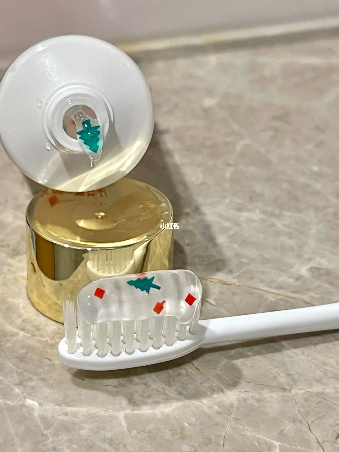 ▼不僅如此,最狂的就是包含牙膏膏體本身也有應景元素,紅色紙片造型與綠色耶誕樹造型亮片,就藏在透明膏體之中超夢幻,一擠出來瞬間被療癒到發芬,可愛牙膏讓人在耶誕期間連刷牙都可以hen應景!