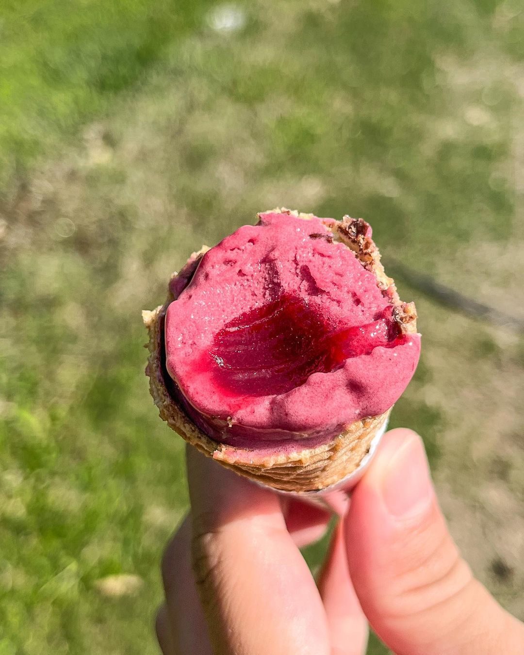 ▼甜筒裡面有塗一層可可,吃的時候能嚐到巧克力的味道,餅皮脆脆的,非常加分!冰淇淋中央還有莓果醬夾心,整體層次感十足。不過奶油感稍重,質地不夠輕盈,吃多會有點負擔。
