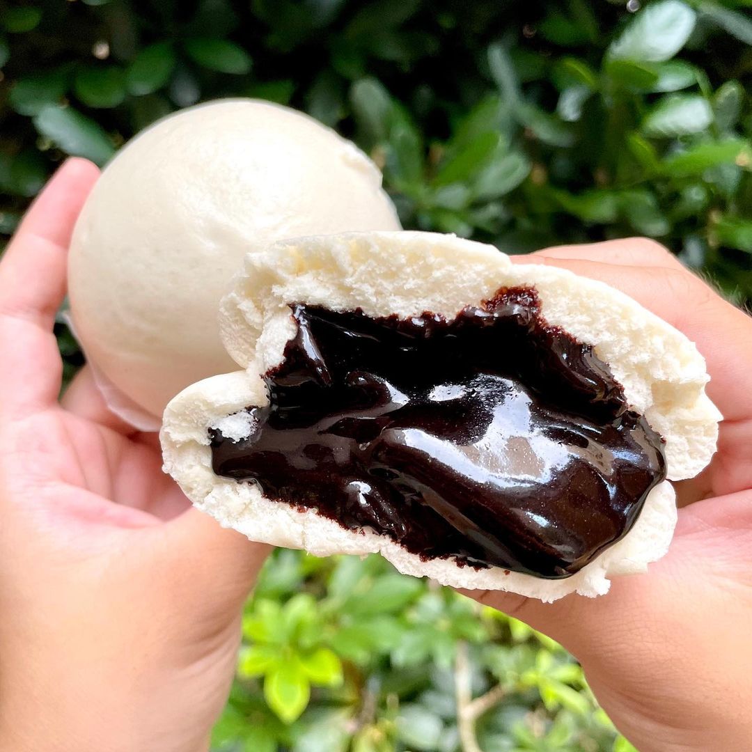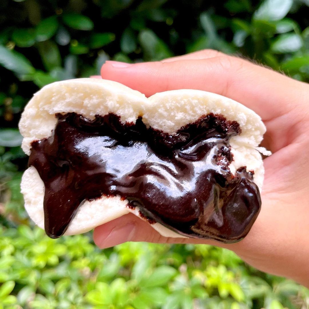 ▼包子的外皮軟中帶Q,巧克力漿內餡微苦不甜膩,趁熱的時候咬下去,濃郁的巧克力漿迫不及待流出來,而且會牽絲,口感豐富,層次感、視覺效果十足!這款熔岩巧克力包不會甜膩,不愛吃甜食的大人也會很愛~