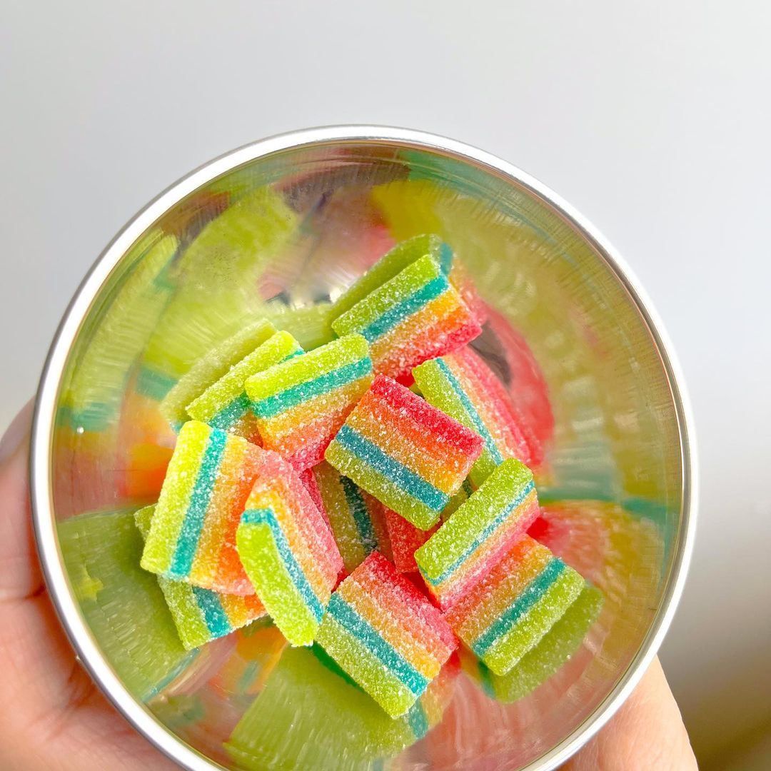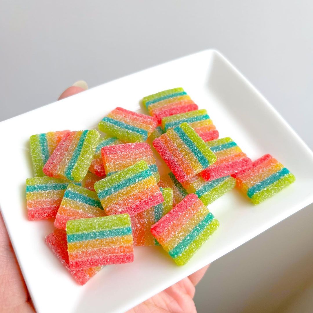 ▼拆開包裝,就能看到一顆顆迷你彩虹!五顏六色的彩虹造型糖果非常討喜,顏值超級高。軟糖上灑有酸粉粗粒,帶來閃閃發亮的朦朧效果,讓這顆充滿童趣的糖果顯得更加浪漫!