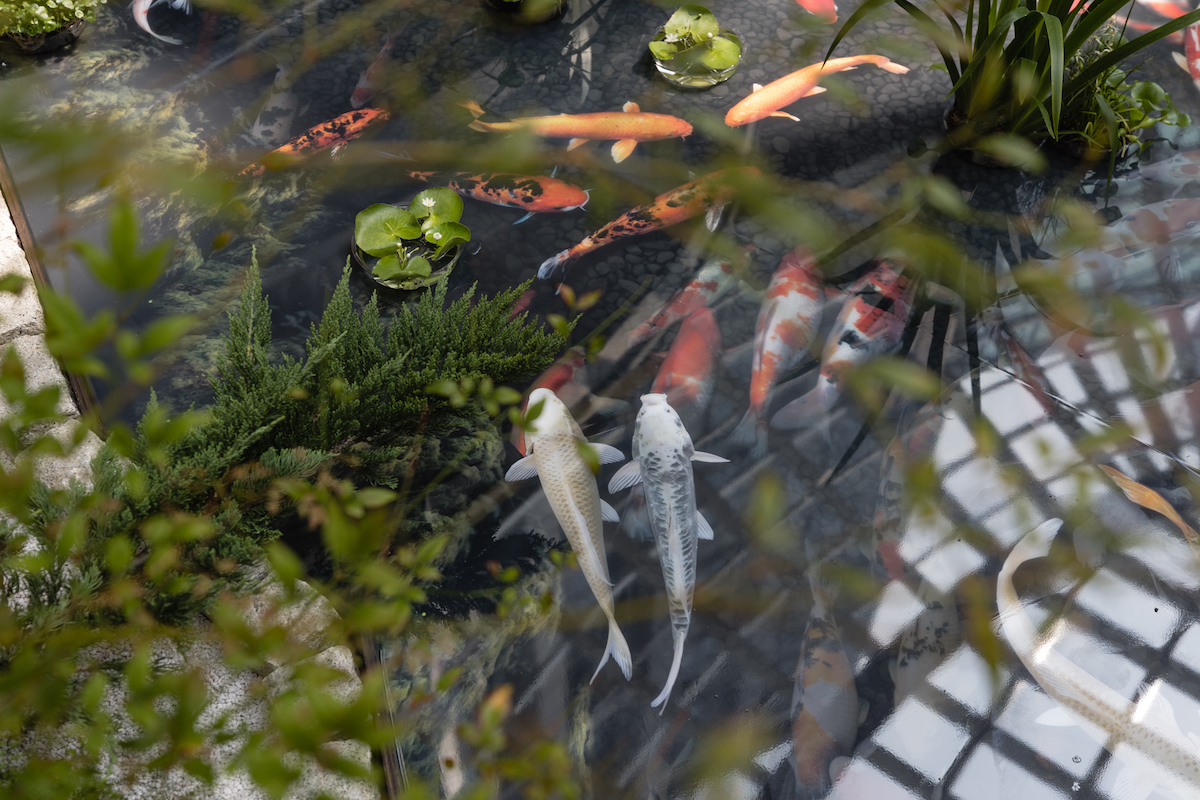 ▼造景中還有石板小徑、拱橋和池塘,池塘中有錦鯉悠游,色彩絢麗,非常夢幻,寓意吉祥長壽,也象徵向上天的祈福,希望能為每一位顧客增添好運 !