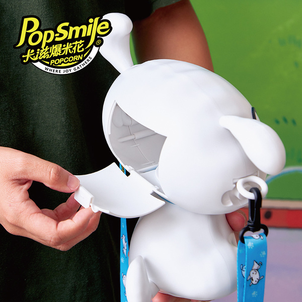 ▼桶身更特別附上了藍色背帶,上頭細緻印上可愛小白的圖案,隨身就可以拎著走。禮盒隨附一包爆米花,口味是香濃的「美式焦糖牛奶爆米花」,散發夢幻的濃郁焦糖和迷人的奶香,可以將爆米花裝到小白內,不管大人小朋友都會喜歡!