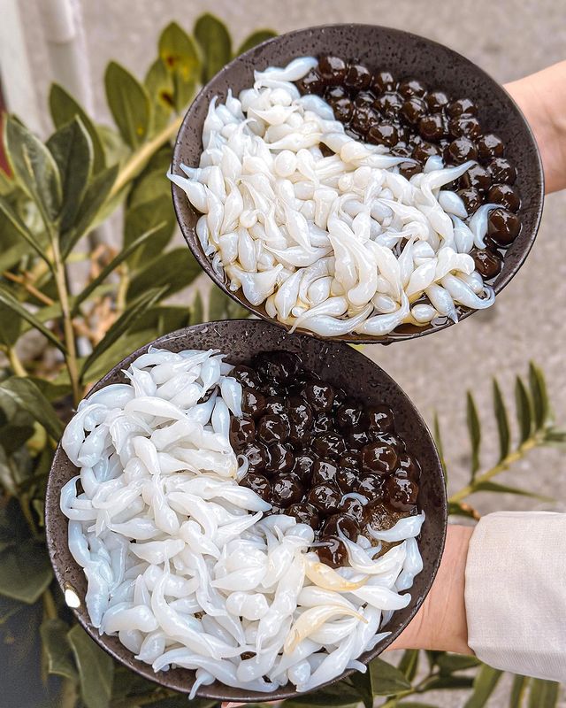 ▼「韓信點冰」推出的「涼蝦」,口感類似米苔目但並不彈牙,反而十分紮實,吃起來滑糯清爽、柔軟清甜,搭配黑糖水和Q彈的珍珠,口感更加豐富,層次感十足,而且越吃越涮嘴,吃過一次就會喜歡上。