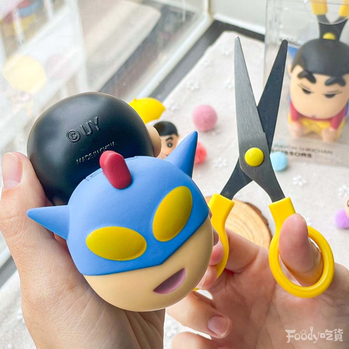 小新直接化身為酷酷剪刀俠!看這淡定的神情,背後經典的動感超人後背包竟然是「剪刀的家」(笑),360度旋轉都是可愛的造型,收納文具原來也可以這麼有巧思呀~