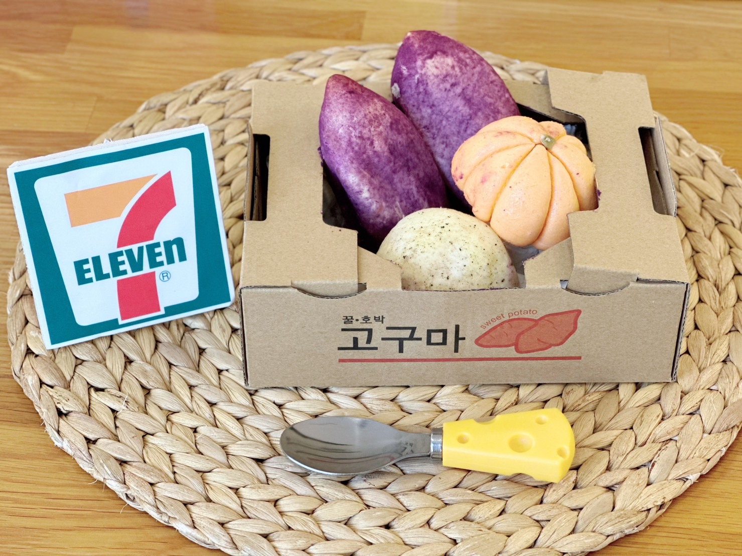 ▼小七還帶來許多美味的甜點,想吃異國美食超商預購就能買到啦!IG爆紅的「韓國擬真麵包」這款麵包的外形像是地瓜、馬鈴薯和南瓜,每個吃起來口味都不一樣!以韓國配方麵粉製作口感外脆內Q,地瓜餡選用台農66號紅肉地瓜,馬鈴薯則搭配起司、奶油與鮮奶,南瓜麵包是以奶油乳酪呈現香甜滋味,每盒還附贈超Q乳酪造型湯匙,送禮自用都相宜~