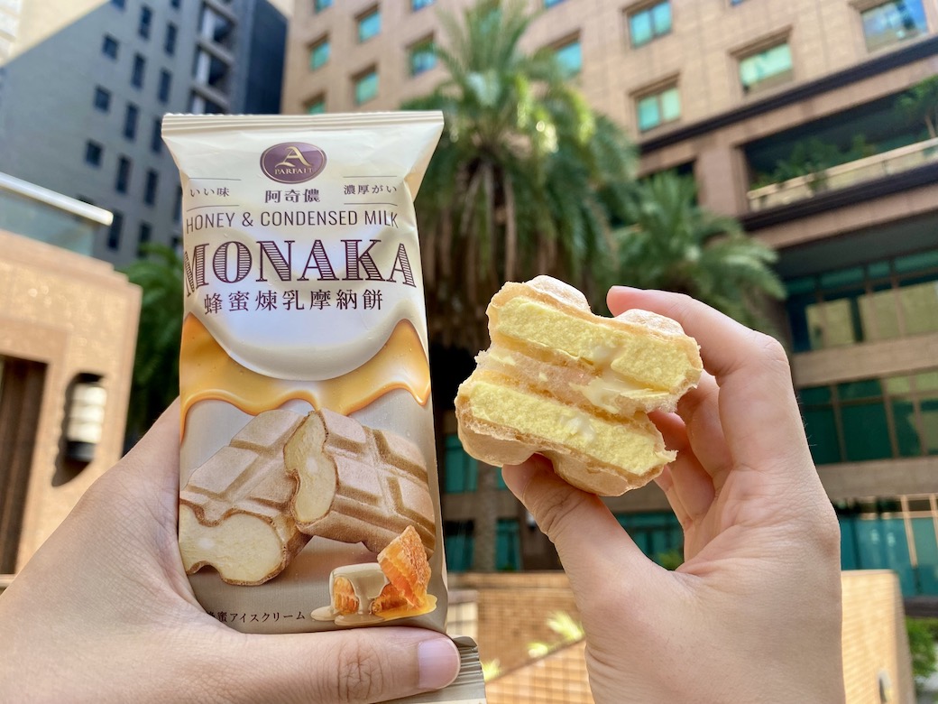▼雖然時序逐漸入秋,但冰品一樣要吃啊!「阿奇儂蜂蜜煉乳摩納餅」則是以香濃蜂蜜味冰淇淋和煉乳醬夾入摩納餅中,摩納餅口感有如薄薄威化餅,蜂蜜冰淇淋香氣濃郁口味清爽,中間以煉乳醬調和,能品嘗到細膩高貴的冰涼口感!