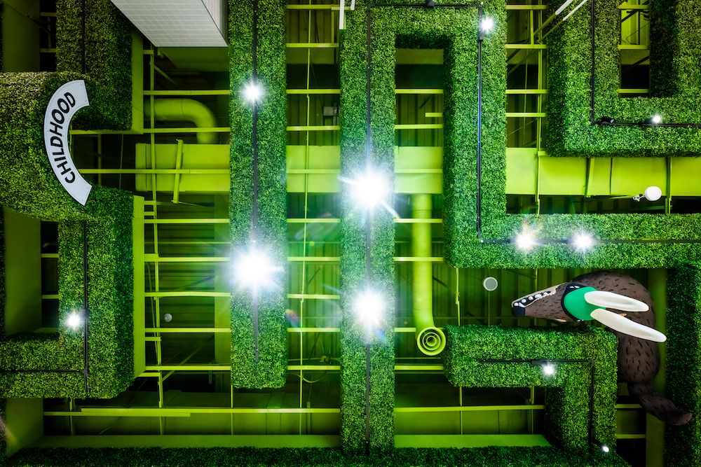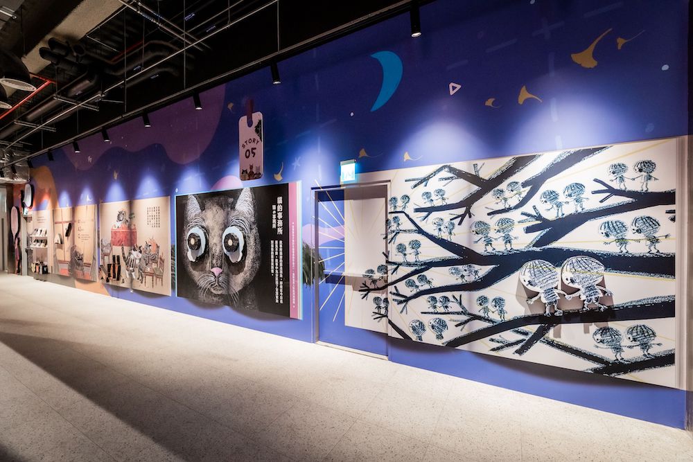 ▼三樓親子區的天花板設計有一個「顛倒迷宮」,你可以看到小紅帽、大野狼等童話人物在上下顛倒的奇幻花園中遊走,充滿童趣又十分夢幻。另外,紅廳的梯廳部分設計獨特,是以無牆美術館為概念,拉近民眾和藝術的距離,讓藝術走入每個人的生活。