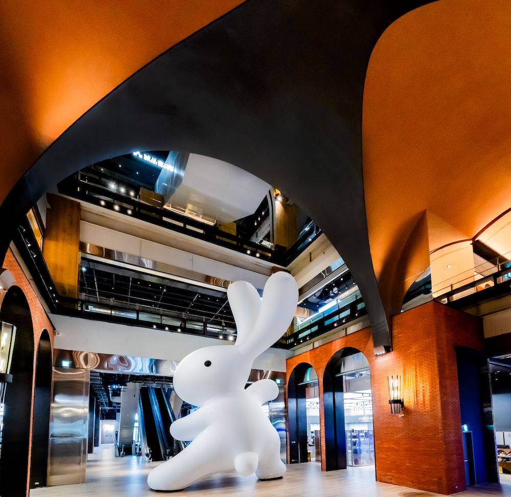 ▼一走進「誠品生活新店裕隆城」,首先會看到一座超巨型兔子裝置藝術。這是藝術家黃本蕊設計的「太極尼尼」,10米高的兔子在做太極,療癒到讓人想要一秒變身為兔子飼主。