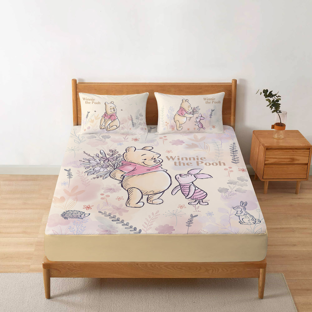 ▼可愛的維尼甚至連寢具也不放過!推出床包組和冰涼被,換上後整個寢具都煥然一新啊!圖片可以看到維尼和萌萌的小豬互動,整體溫柔粉嫩,睡在上面絕對能做個美夢吧~