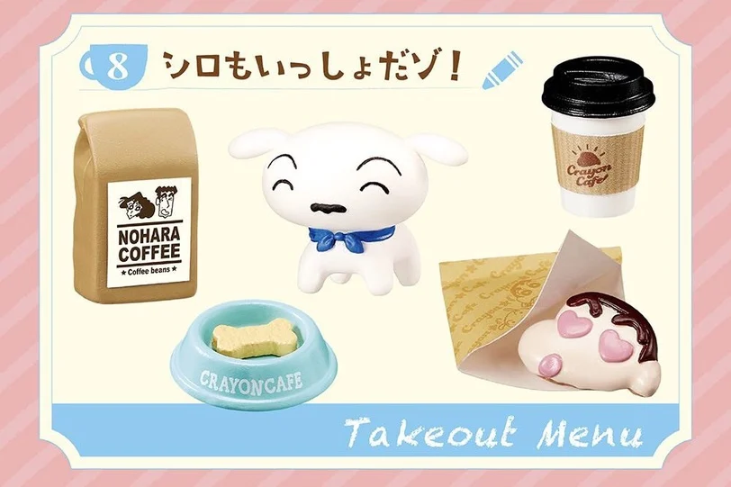 ▼這一次,小新和他的夥伴們化身為可愛的餐點,組成8個組合,包括小白卡布奇諾、小新咖哩飯、我們的特製披薩、肥嘟嘟左衛門漢堡、吃薯條加蕃茄醬、葡萄冰淋淇汽水、春日部防衛隊的午餐、小白鬆餅及外帶餐點,一起組成「蠟筆小新咖啡廳」,實在太療癒!