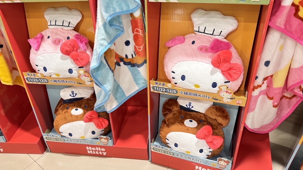▼「小豬廚師」和「水手小熊」款也是讓人無法割捨!水手帽未免太適合Hello Kitty了吧~這些柔軟的抱枕還能化身抱枕毯,每款抱枕更有獨特的圖樣,冬季披在身上,瞬間想賴在沙發上不想起來惹~