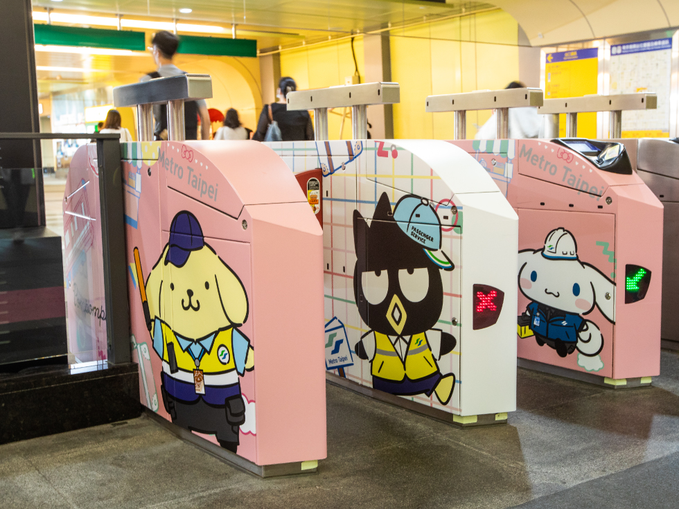 ▼進站的票口也有Kitty、布丁狗、大耳狗、美樂蒂、酷企鵝、蛋黃哥的身影,歡迎大家進入三麗鷗的歡樂世界。大家可以下載「台北捷運GO」APP,於首頁點選「自訂服務」按鈕,選取「動態資訊」功能,即時查看彩繪列車位置,不錯過任何訊息。