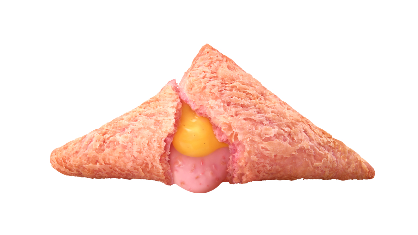▼「草莓流心卡士達三角派」的外觀是浪漫的粉色,吃起來也超美味。一口咬下去,草莓和卡士達的豐富香氣立刻在口中蔓延開來!而且這個三角派會流心,酥脆派皮外殼里,草莓巧克力和香甜卡士達兩種內餡雙重流心,一次就能滿足你對甜的渴望!