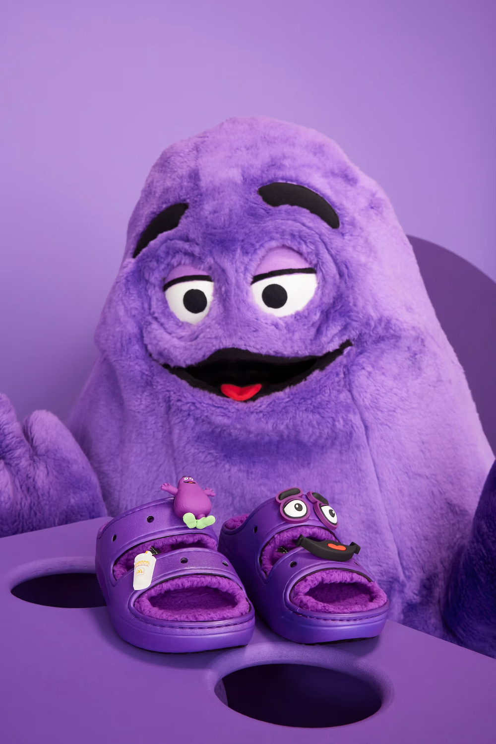 ▼「大鳥姊姊款」鞋子上有滿福堡的鞋扣,這代表著麥當勞令人垂涎的早餐系列。每一次踏出去,都能讓你回味那些晨間的好滋味;最搶眼的非「奶昔大哥款」莫屬,這款涼拖不僅擁有醒目的紫色,還配上了毛絨絨的質感,走到哪都能感受到奶昔大哥的溫暖擁抱。