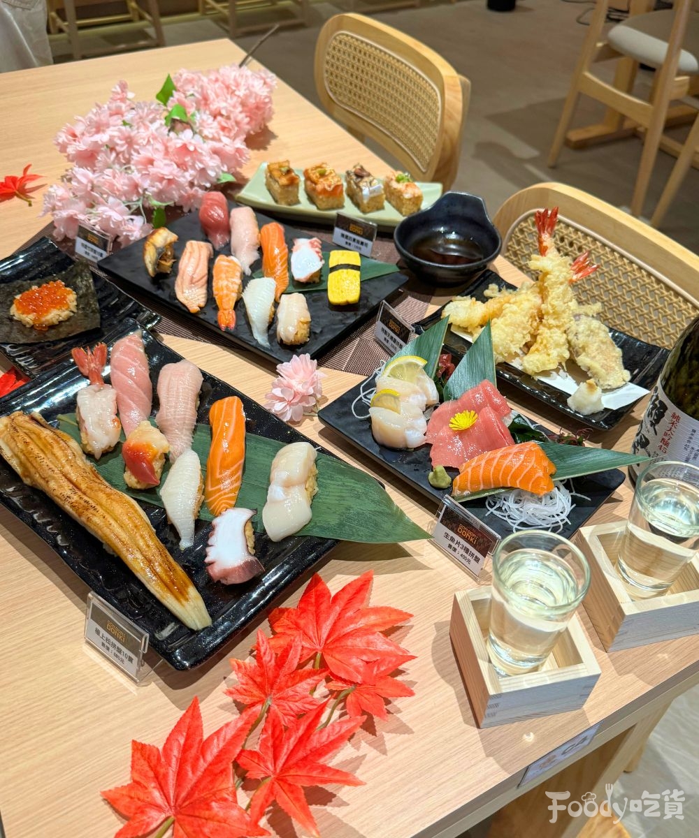 極上松拼盤 10貫,售價:680元;特選竹拼盤 10貫,售價:440元;生魚片3種拼盤,售價:400元;特製天婦羅拼盤,售價:320元;精選四貫箱壽司,售價:120元。11/9至11/17:日本酒半價;11/18~12/9:梅酒、燒酌、highball半價。