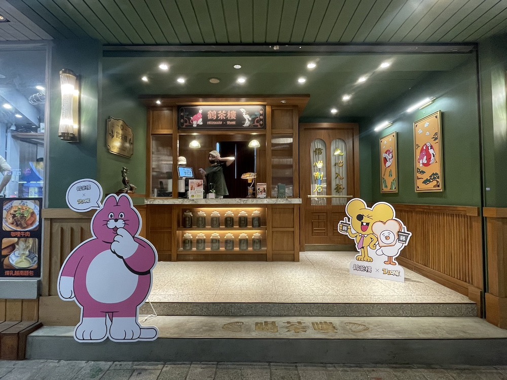 ▼鶴茶樓的門市也換上聯名版裝飾,彷彿走進療癒的世界周邊。東方山水畫元素充滿著畫面,美式風格與東方調性完美結合,從櫃檯匾額、牆面裝飾、到人形立牌,都會出現ZIZONE的身影。ZIZONE角色搭乘丹頂鶴一起來台灣喝珍奶!