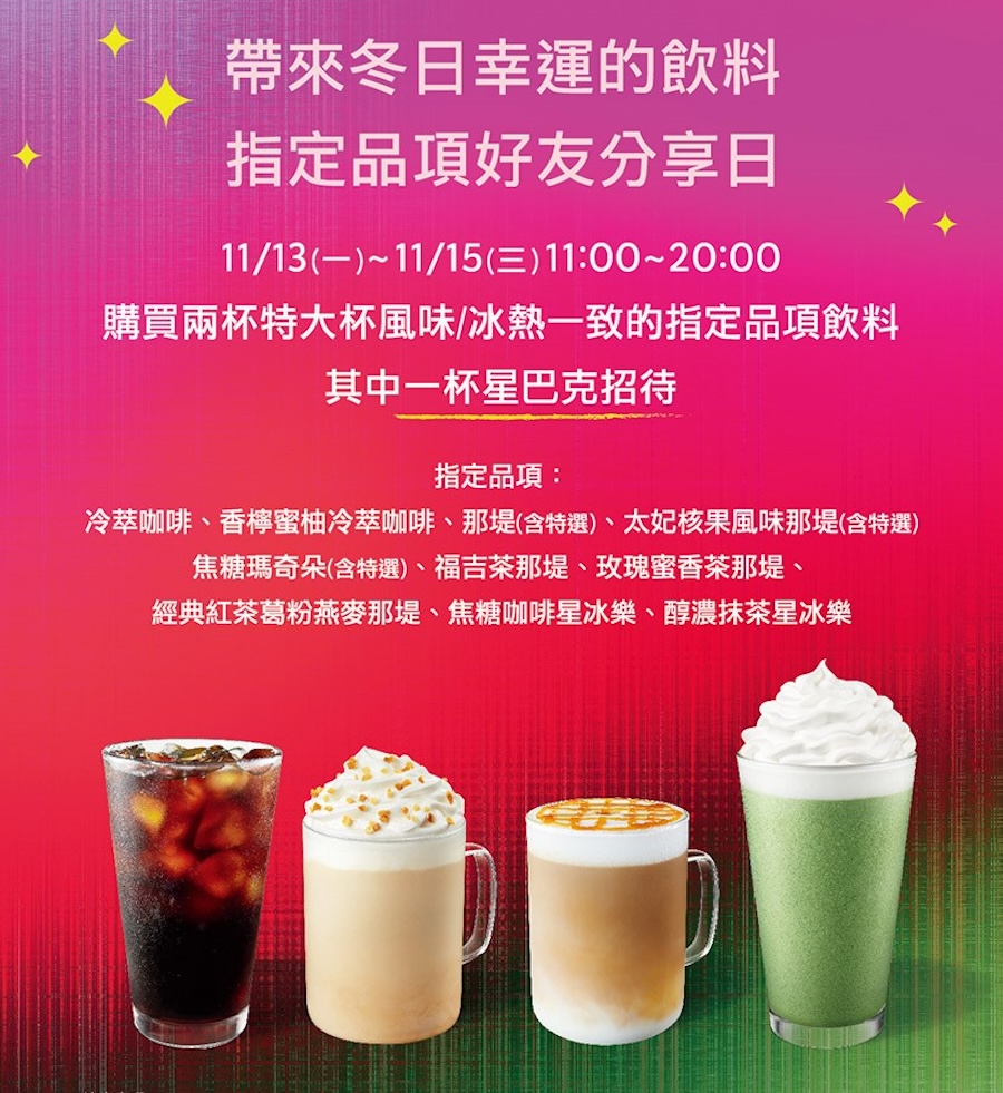 ▼就在11/13-11/15!星巴克默默推出「指定品項好友分享日」,活動當日11:00-20:00到門市購買兩杯特大杯/風味/冰熱一致的指定品項飲料,其中一杯就由星巴克招待。其中更有2款「星冰樂」可以選擇,包括「焦糖咖啡星冰樂」和「醇濃抹茶星冰樂」,喜歡咖啡或抹茶香氣都可以自由選擇,連續3天給他喝起來!