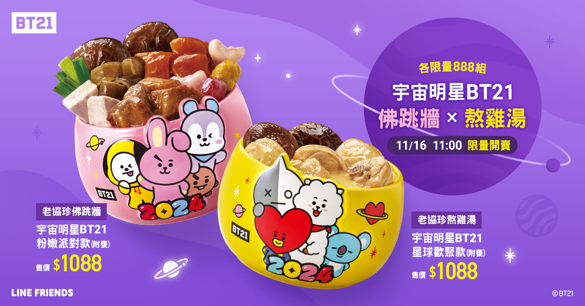 2023年11月13日2024年,台灣將迎來一場宇宙魅力的全新年節饗宴啦!全球知名的宇宙明星BT21攜手老協珍,共同推出了超卡哇伊的新年美食「BT21佛跳牆、熬雞湯」。這些美味佳餚搭配兩款萌度爆表的立體造型甕,超明亮的配色成為桌上最搶眼的主角,瞬間擄獲了粉絲們的心,選擇障礙只能紛紛表示:「兩款一起收藏!」