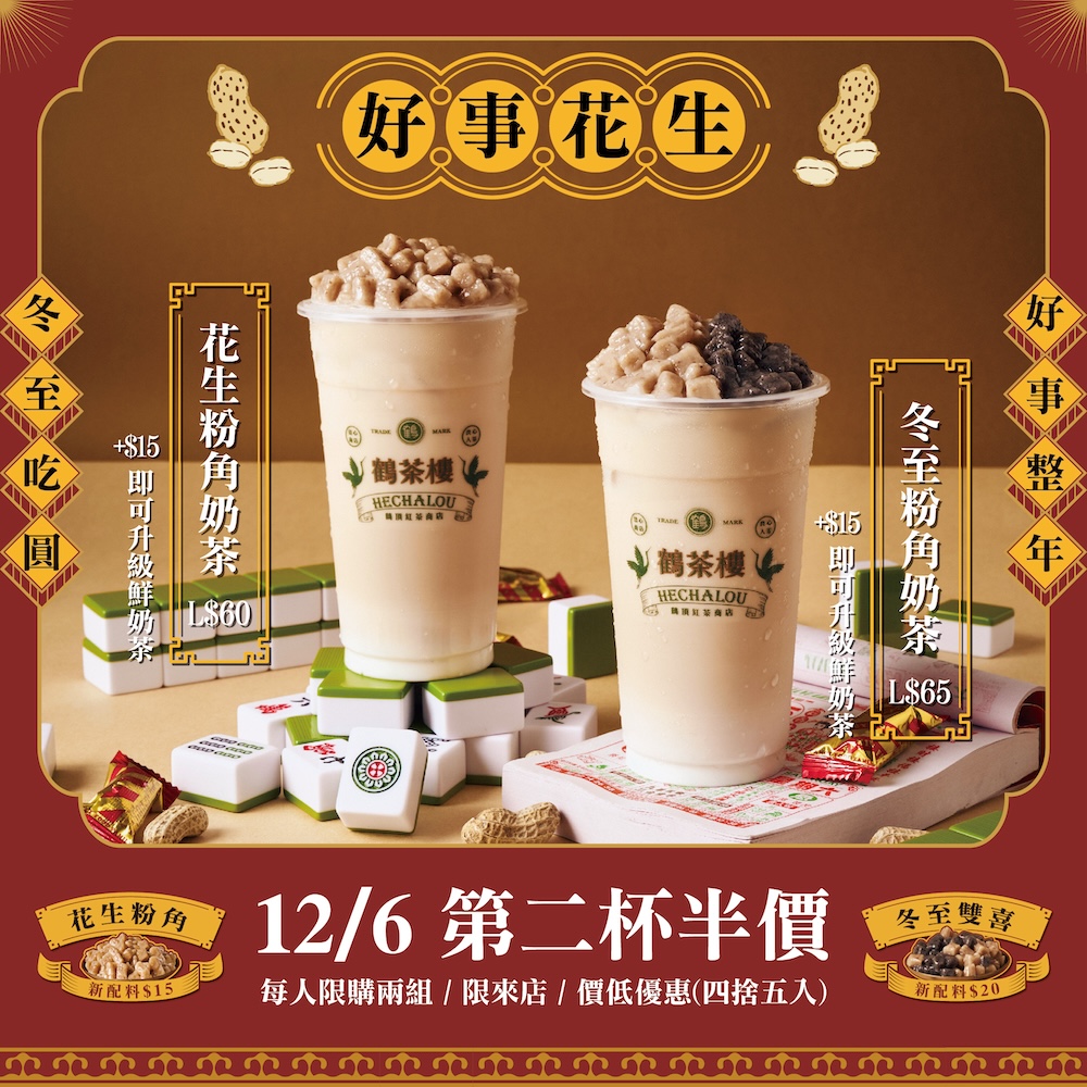優惠內容:冬至粉角奶茶、花生粉角奶茶以上兩杯任搭,享第二杯半價。