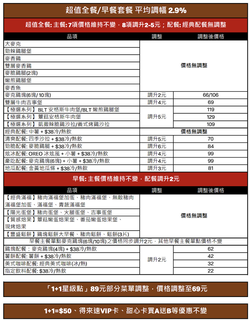 配餐:經典配餐(中薯+ $38 冷/熱飲)價格維持不變,其餘配餐價格調升3-6元。