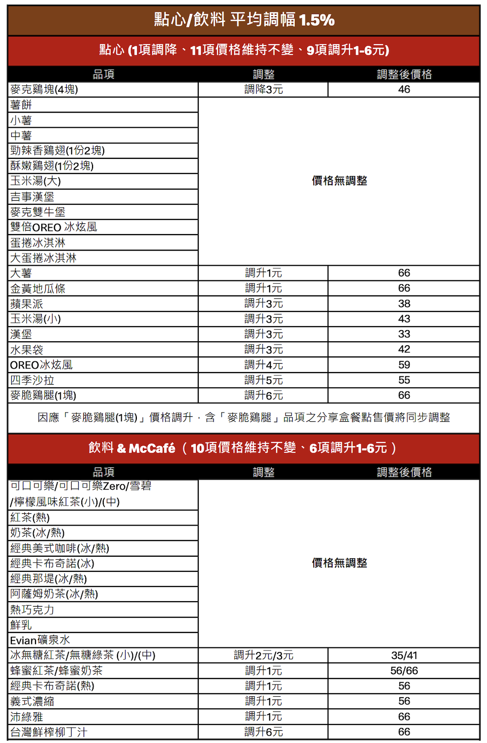 點心飲料類:4塊麥克鷄塊調降,部分點心、飲料調升