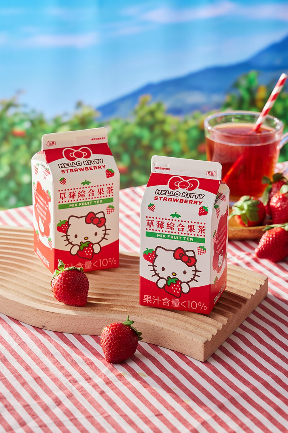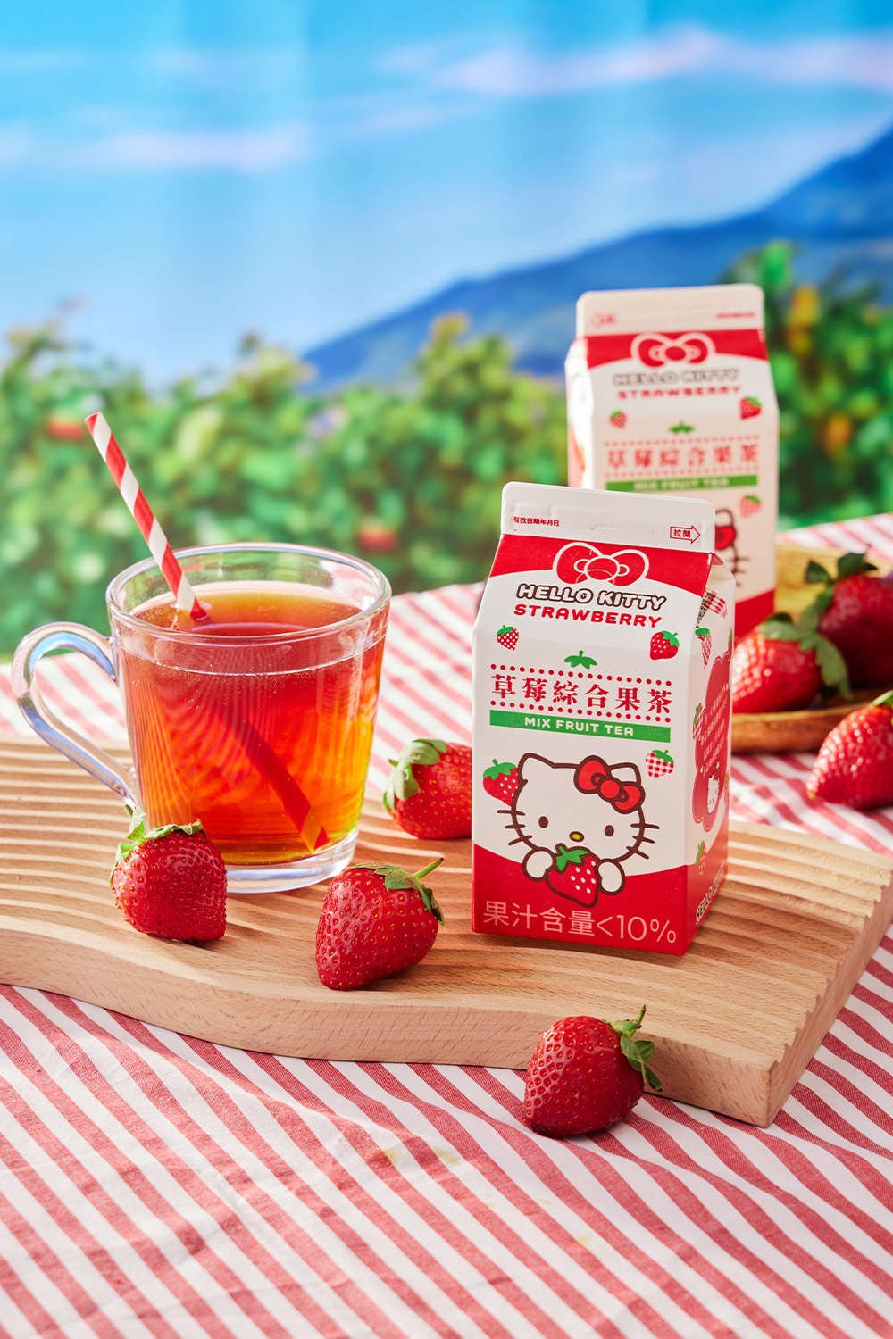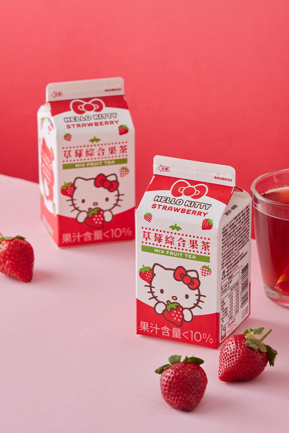 ▼首先讓我們來看看慶祝Hello Kitty50週年的「Hello Kitty 草莓綜合果茶」!這款飲品的包裝以Hello Kitty的經典色系設計,一眼看到Kitty在享用草莓的模樣,讓人心情馬上好起來~
