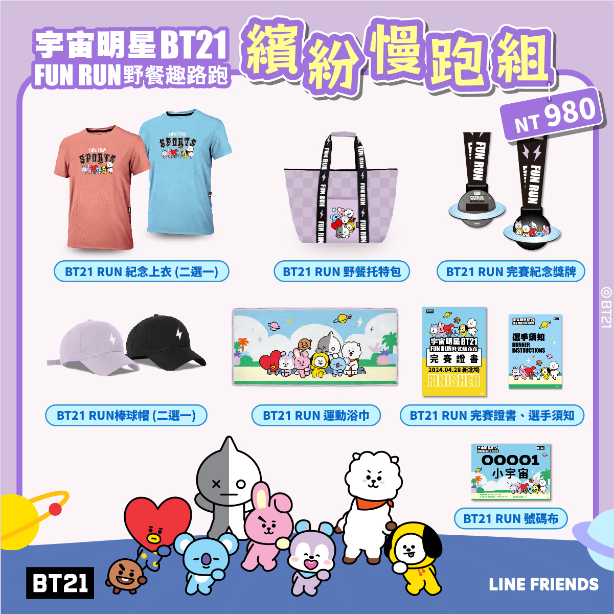 ▼提前來了解一下路跑物資!共有「繽紛慢跑組」、「快樂野餐組」兩大組別可供選擇。980元的「繽紛慢跑組」包含了專屬的BT21運動配件,如野餐托特包、棒球帽、運動浴巾和紀念上衣,絕對是運動和時尚的完美結合。而1980元的「快樂野餐組」則更加豐富,除了上述物品,還有專屬的野餐墊和桌椅組,是戶外活動的理想選擇。