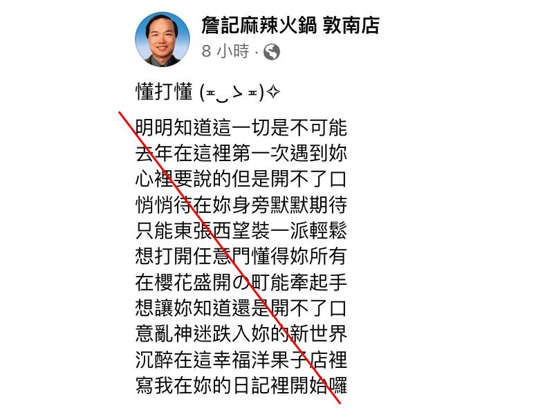 ▼元旦前詹記在其粉絲專頁上發布了一則有趣的藏頭詩貼文,透露了即將開設新店的消息。貼文中巧妙地隱藏了一句話:「明年要在西門町開新店囉」,這個幽默而創意的發布方式,立刻引起了眾多麻辣鍋控熱議。超級難訂的詹記終於要有新分店啦!