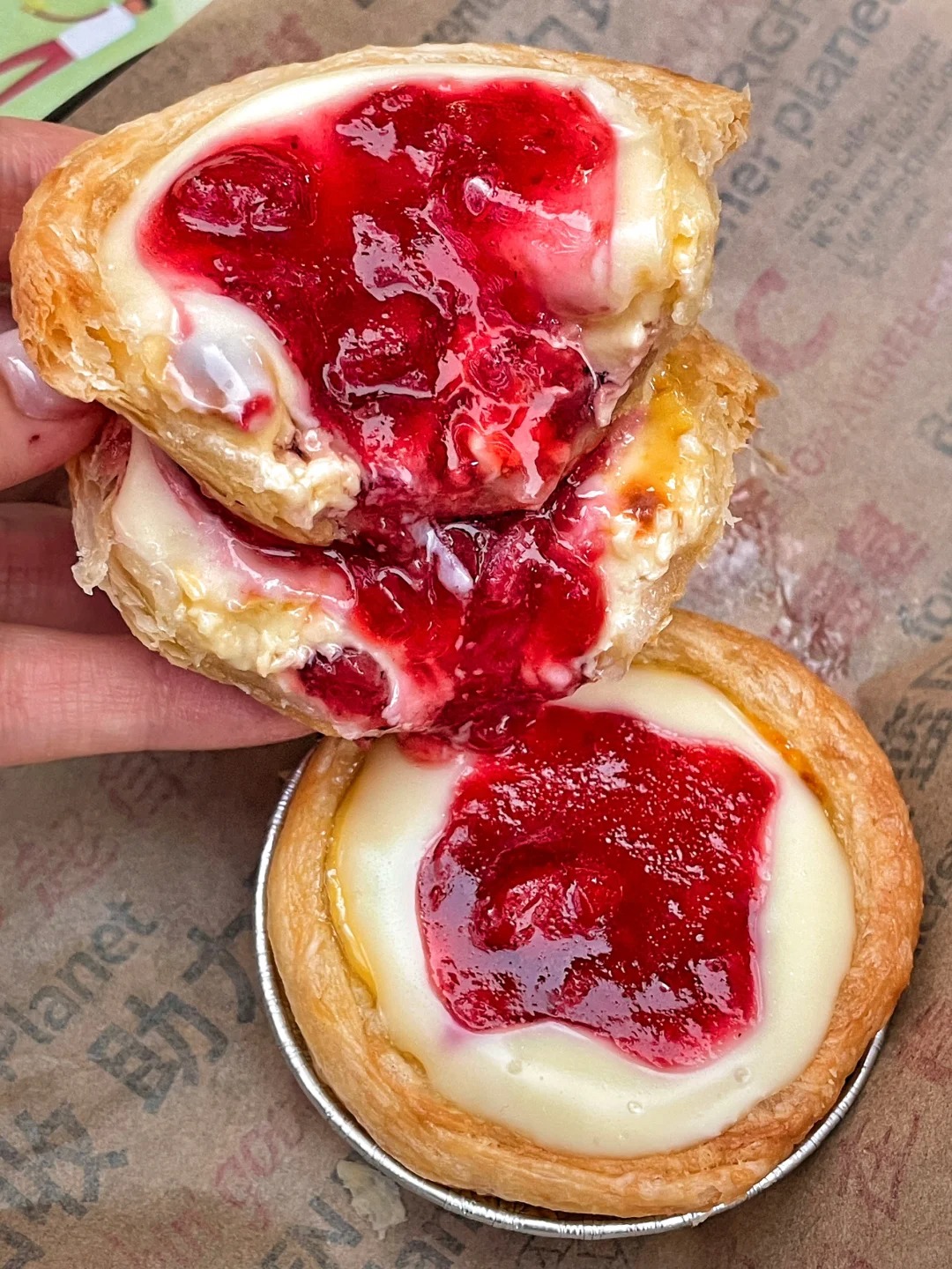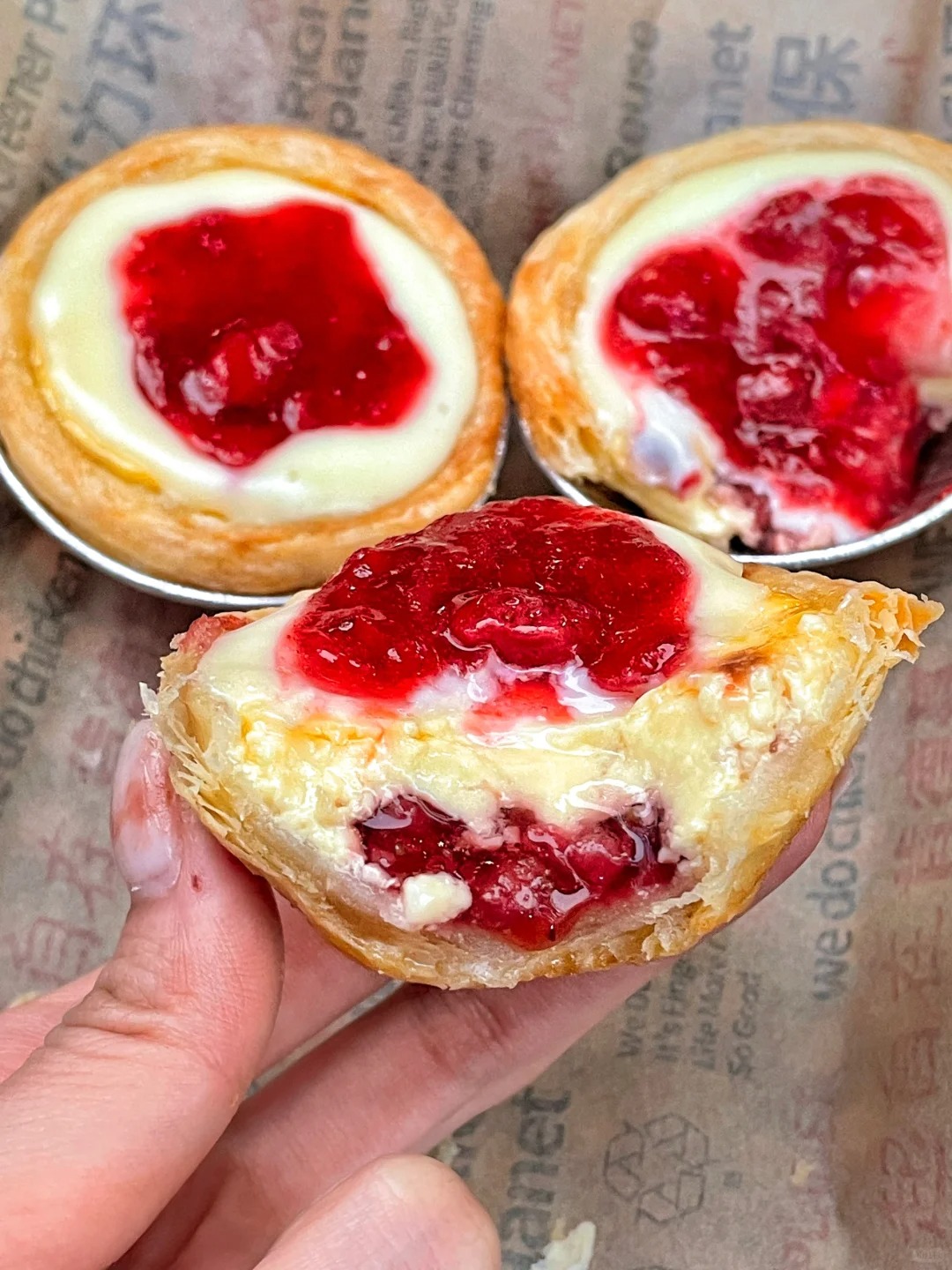 ▼這款蛋撻的外皮也是酥脆到不行,一口咬下去鹹甜可口,層次感十足,好吃到讓人把舌頭都要吞下去。