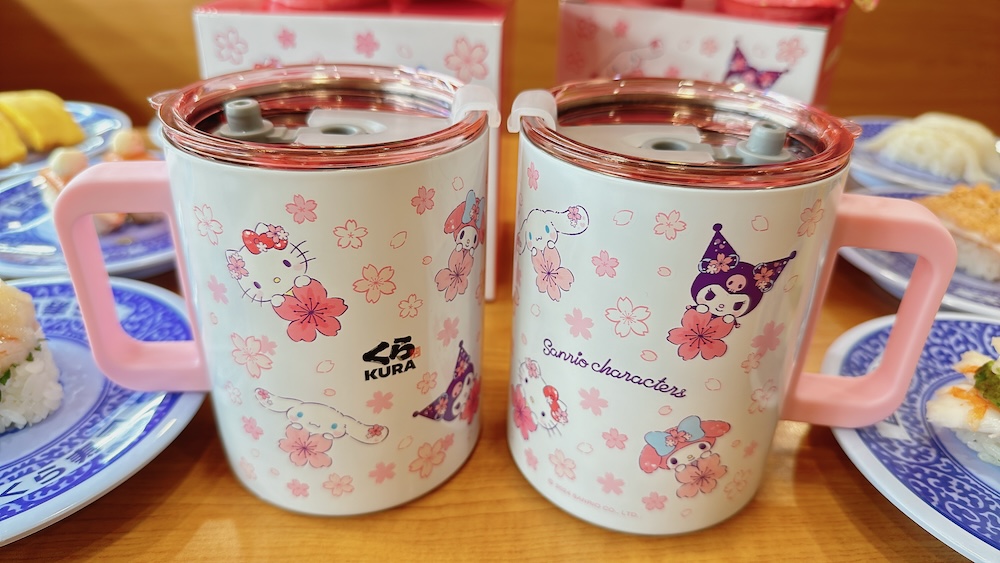 ▼Hello Kitty特別換上粉色櫻花和服,超有新年節慶氛圍!手中還捧著一貫壽司,擺在家裡就是最春天的裝飾。不銹鋼杯上則是Hello Kitty與酷洛米、大耳狗、美樂蒂齊聚,紛紛與櫻花合影,杯子還附有手把,喝水喝飲料都實用~
