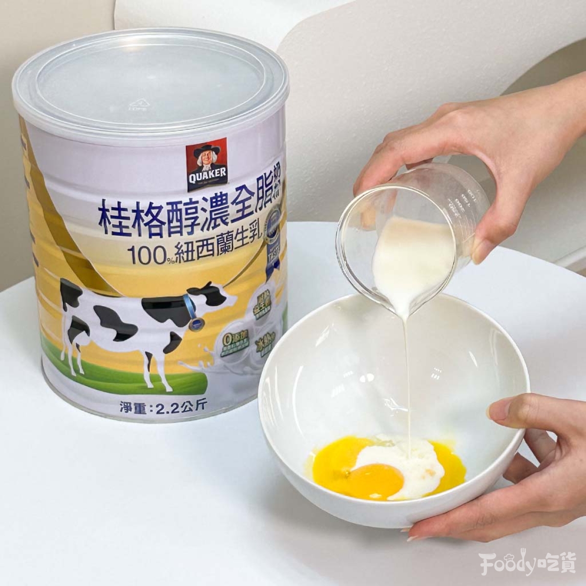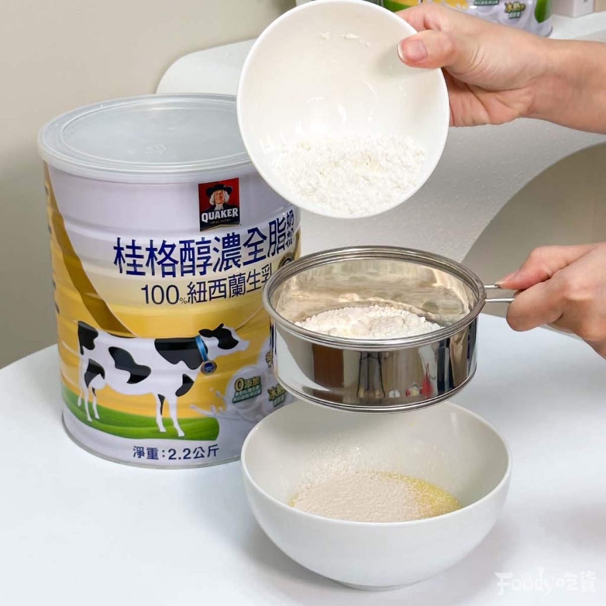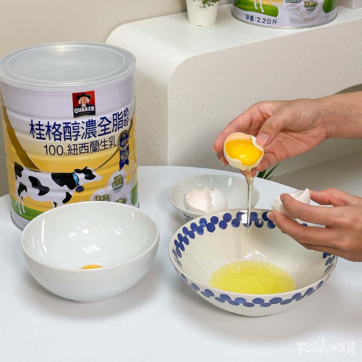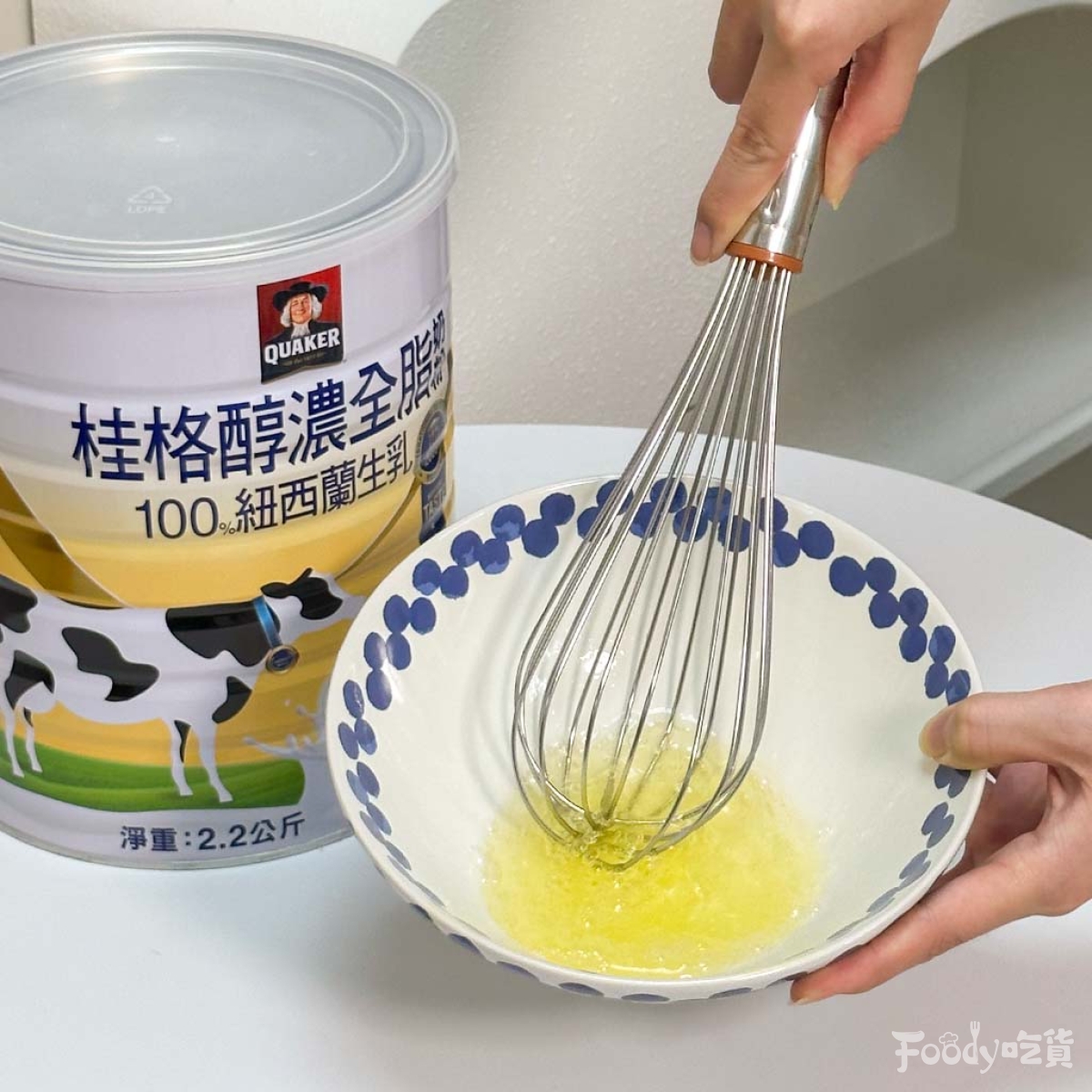 ▼拿出「桂格醇濃全脂奶粉」,可別以為它只能泡牛奶,做甜點也是超實用!隨時可拿來沖泡,而且冰沖就像鮮奶,做甜點時奶香更加濃郁,同時還能全憑個人喜好調整奶香的濃淡程度!不只為口感加分,還能提供優質奶蛋白。將沖泡好的桂格醇濃全脂奶粉,加入蛋黃中攪拌,打到顏色稍稍變白。這時就能聞到奶香散發,讓人超期待成品的美好滋味~