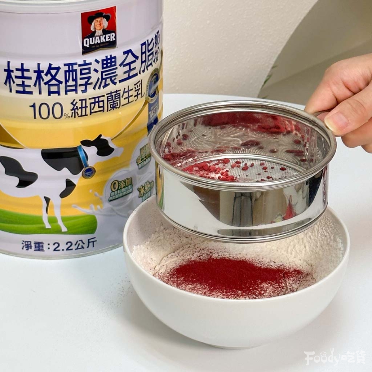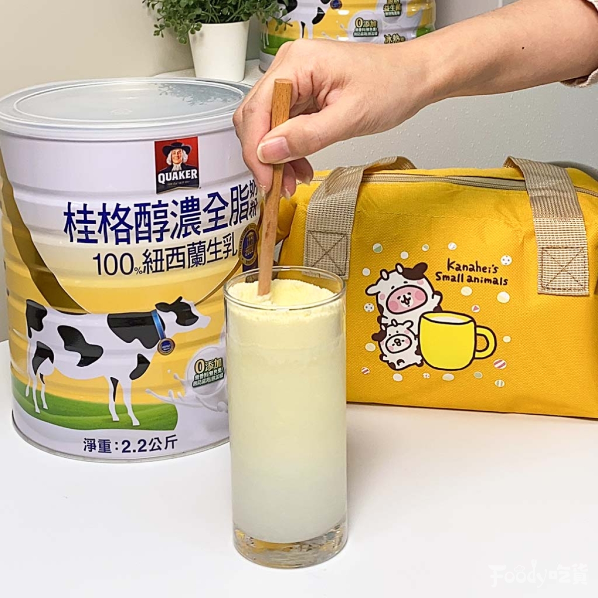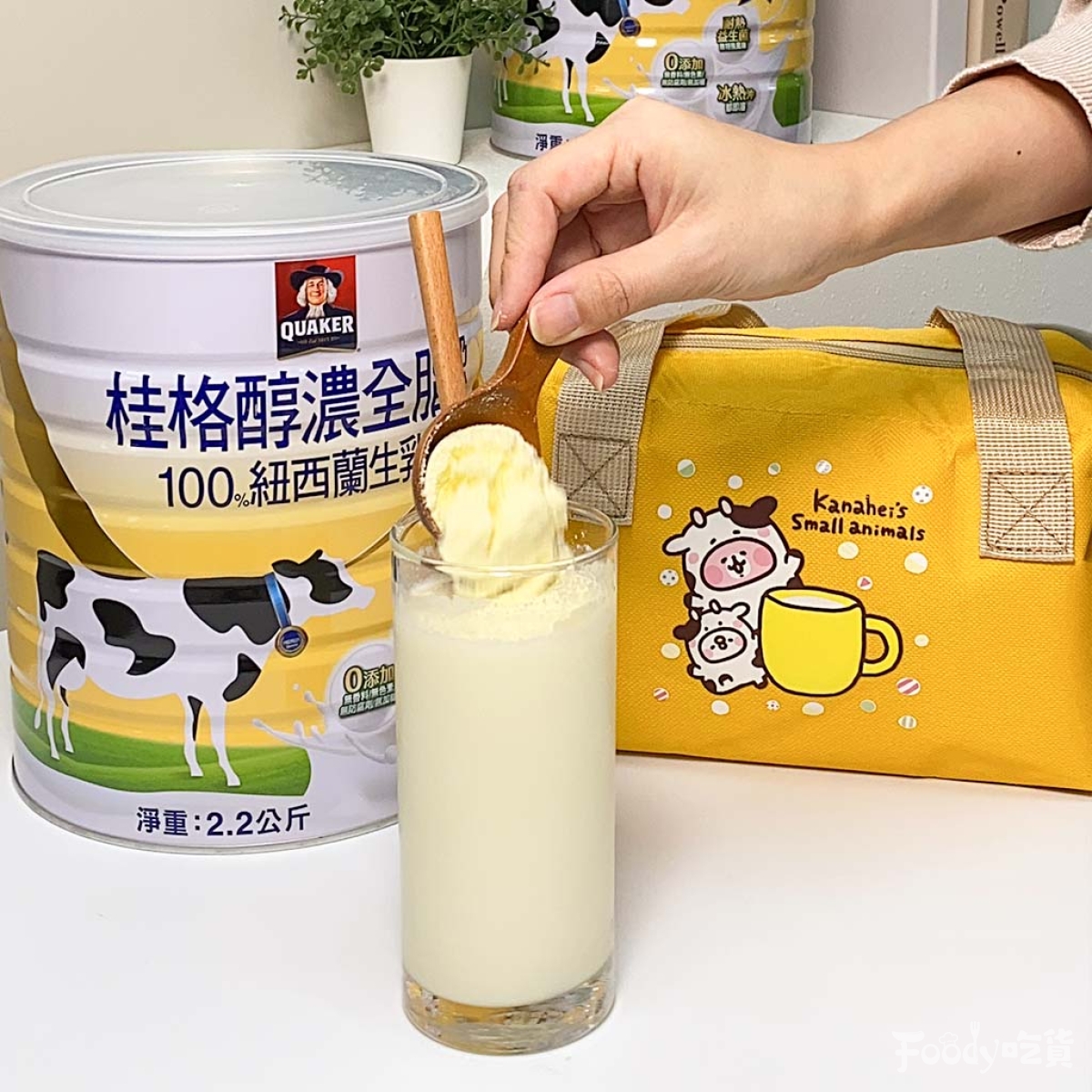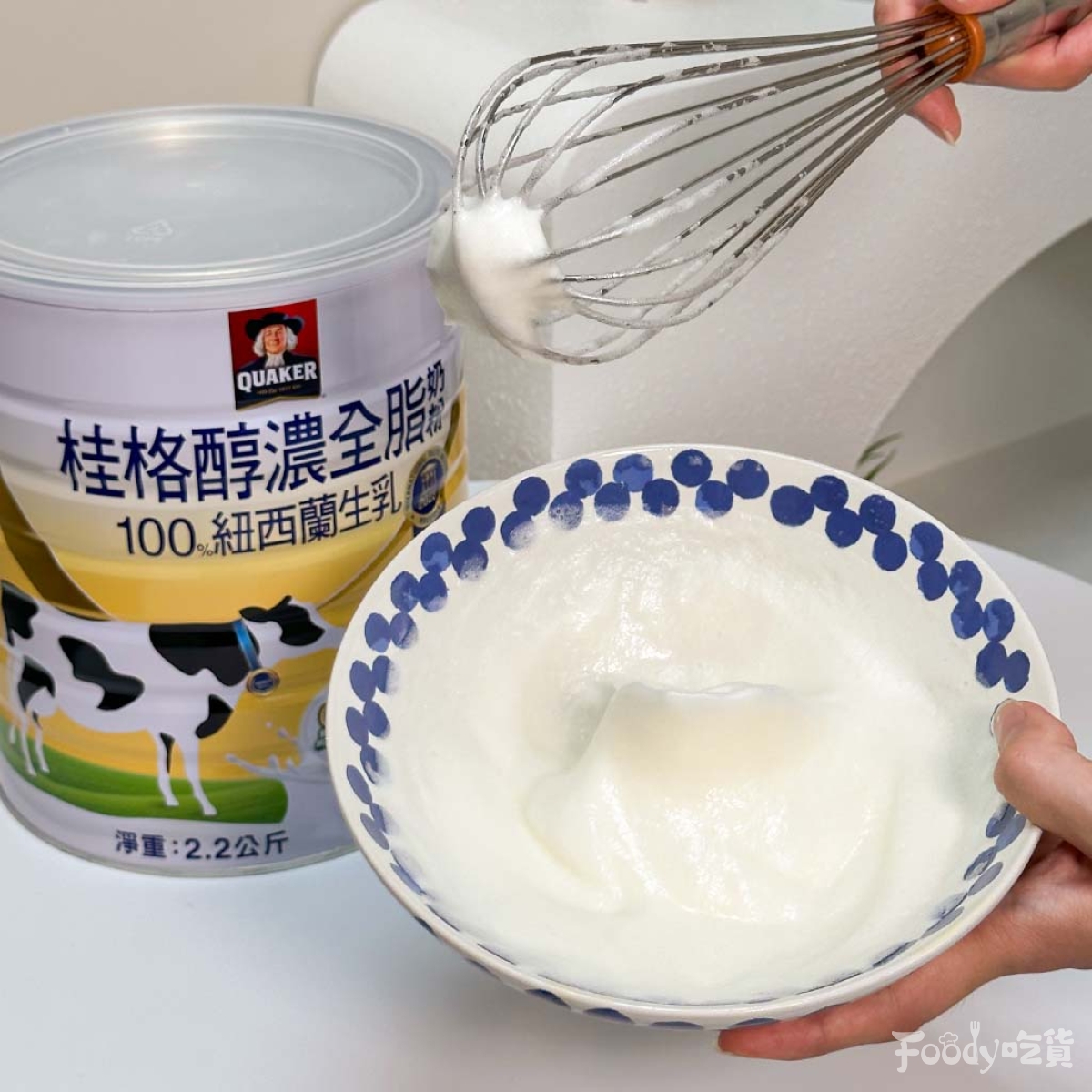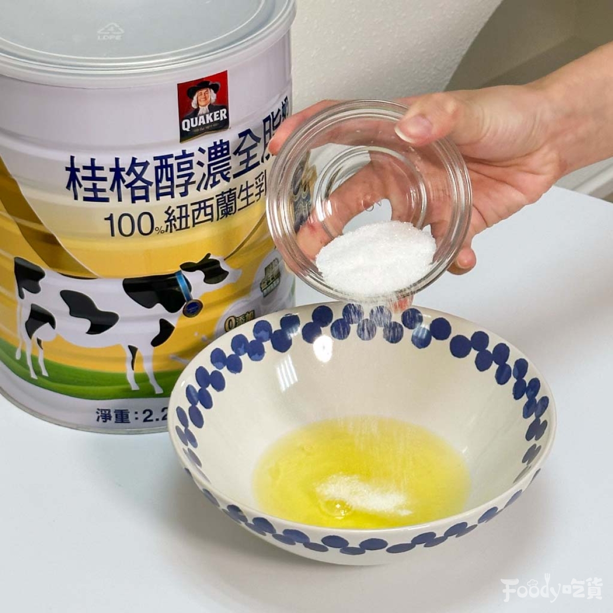 ▼拿出「桂格醇濃全脂奶粉」,可別以為它只能泡牛奶,做甜點也是超實用!隨時可拿來沖泡,而且冰沖就像鮮奶,做甜點時奶香更加濃郁,同時還能全憑個人喜好調整奶香的濃淡程度!不只為口感加分,還能提供優質奶蛋白。將沖泡好的桂格醇濃全脂奶粉,加入蛋黃中攪拌,打到顏色稍稍變白。這時就能聞到奶香散發,讓人超期待成品的美好滋味~