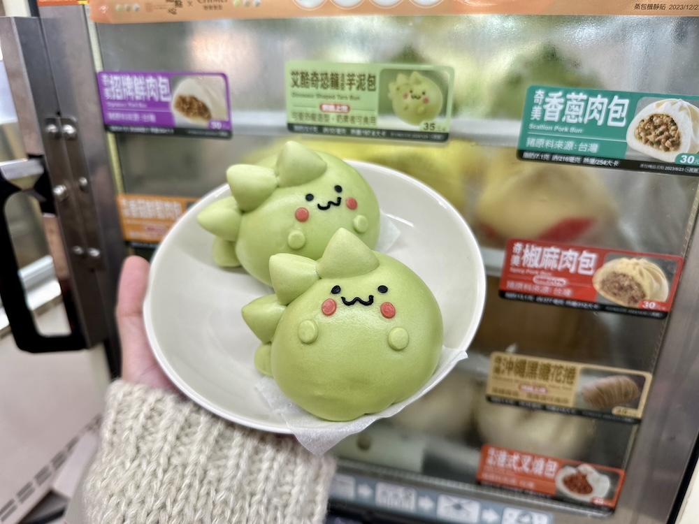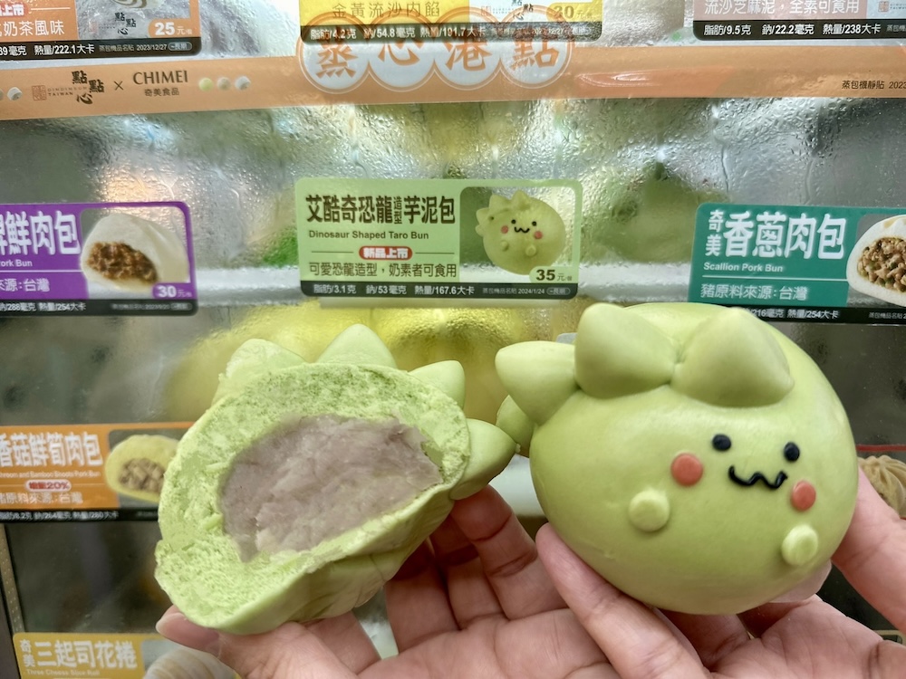 2024年01月25日年節前後,許多美味的限定食物又出沒啦!7-ELEVEN推出讓人眼睛一亮的「恐龍造型芋泥包」,就在店內的蒸食機中!綠色的恐龍芋泥包臉上帶著微笑,整個可愛到不行!此外還推出「星級饗宴」品牌的特別刈包,與台南晶英酒店合作,老饕們快品嚐!
