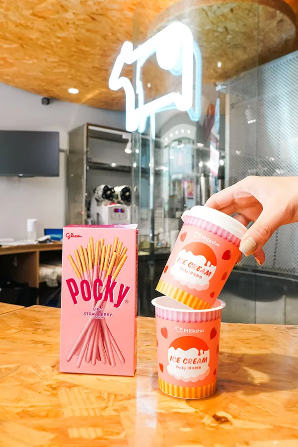 ▼「庫奇草莓歐蕾冰淇淋」使用超可愛的「Pocky草莓棒」聯名包裝,好吃又好拍,絕對是收藏級的美味呈現!這種夢幻組合,只在迷客夏全台門市限時販售。